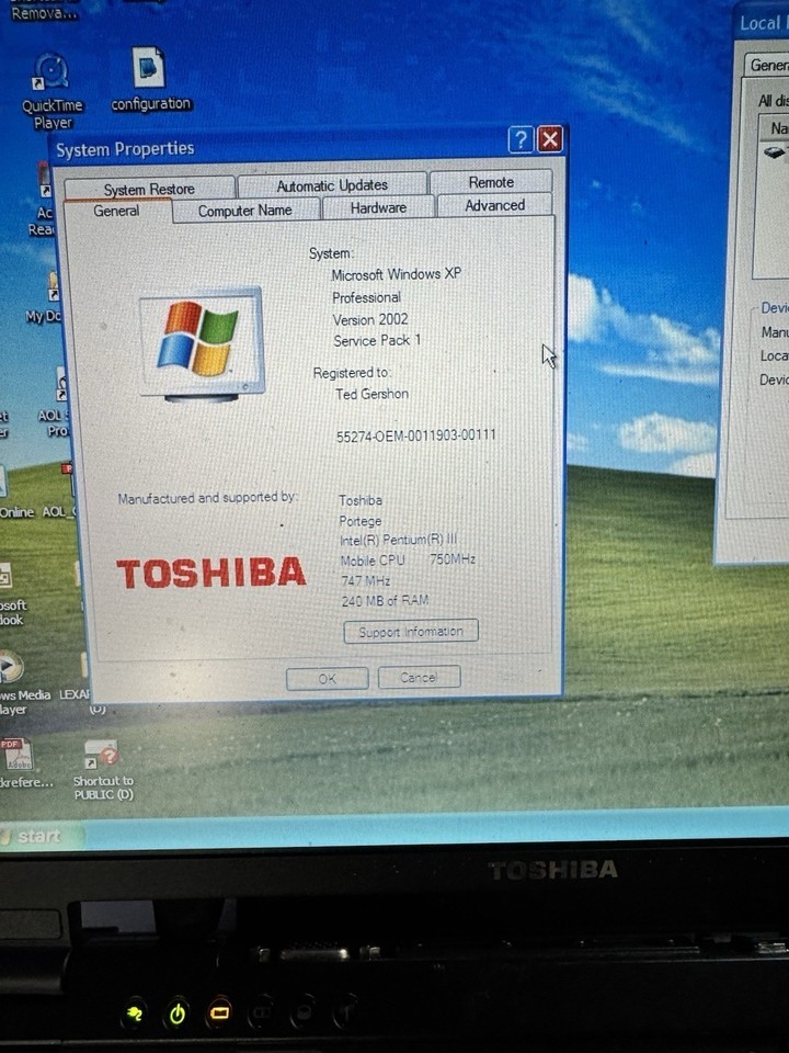 Toshiba Protege 2000 Vintage Win XP Laptop Pentium 3 750mhz 240mb Ram 20gb HD