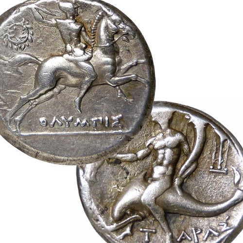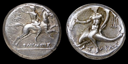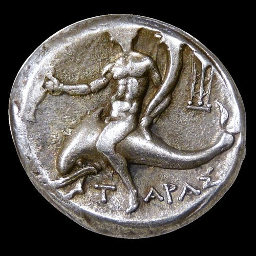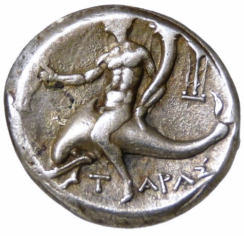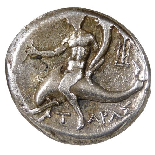 Reverse: Phalanthos, nude, holding kantharos (two handled high pedestal wine cup) and cornucopia, riding dolphin left; tripod to right; TAPA? (TARAS in Greek) below.