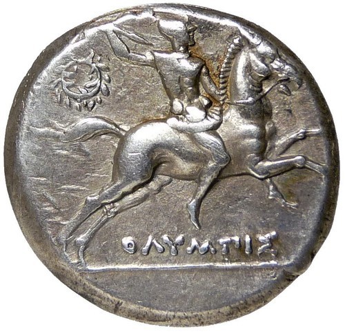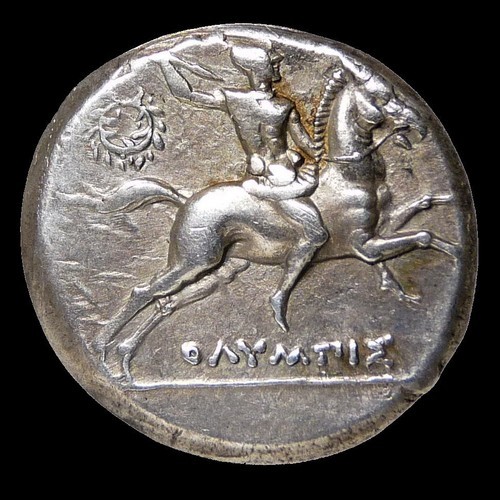 Obverse: Warrior, nude, preparing to throw javelin, on horse galloping right; wreath to left, O?YM?I? (OLYMPIS in Greek) below above groundline.