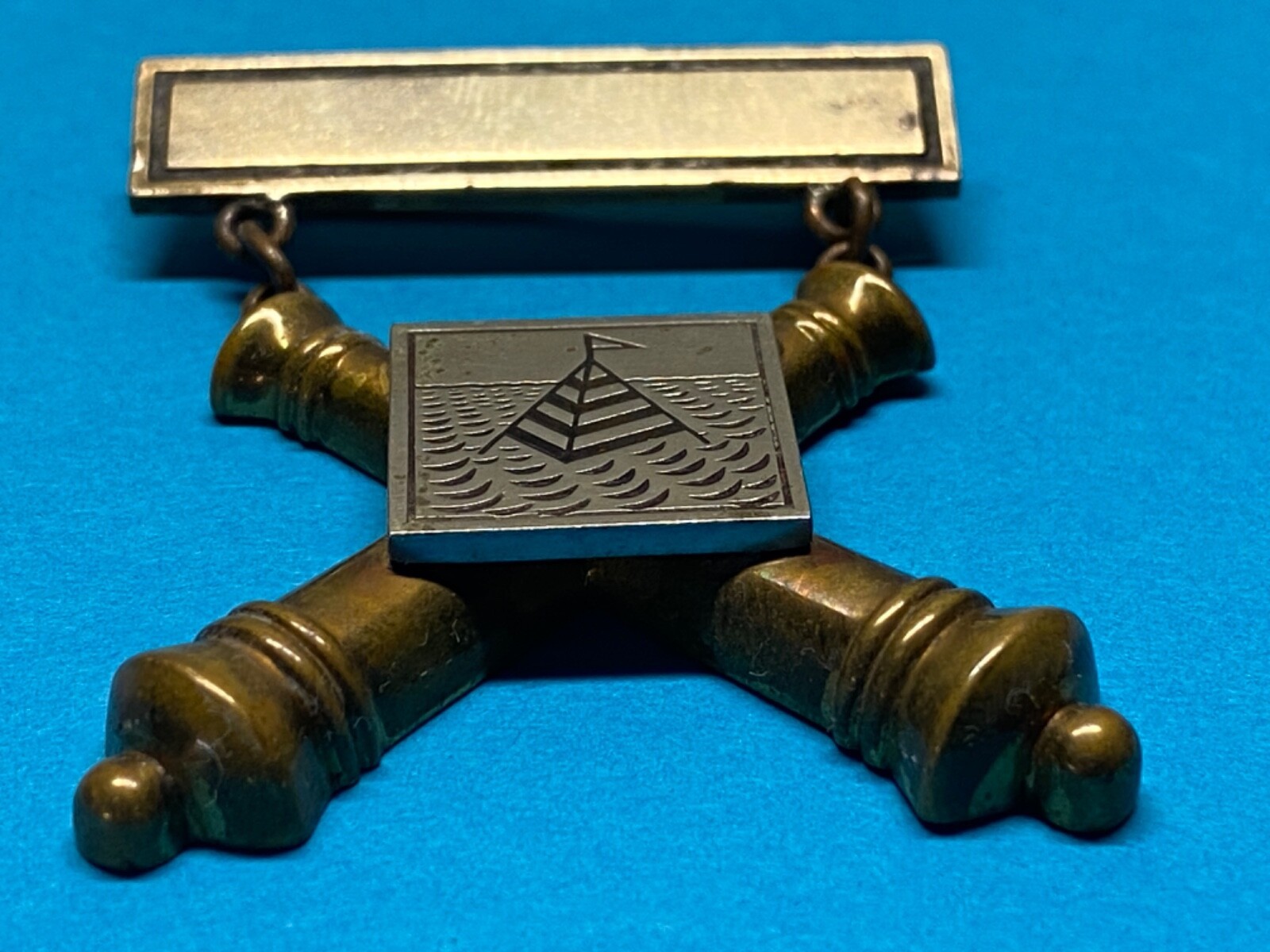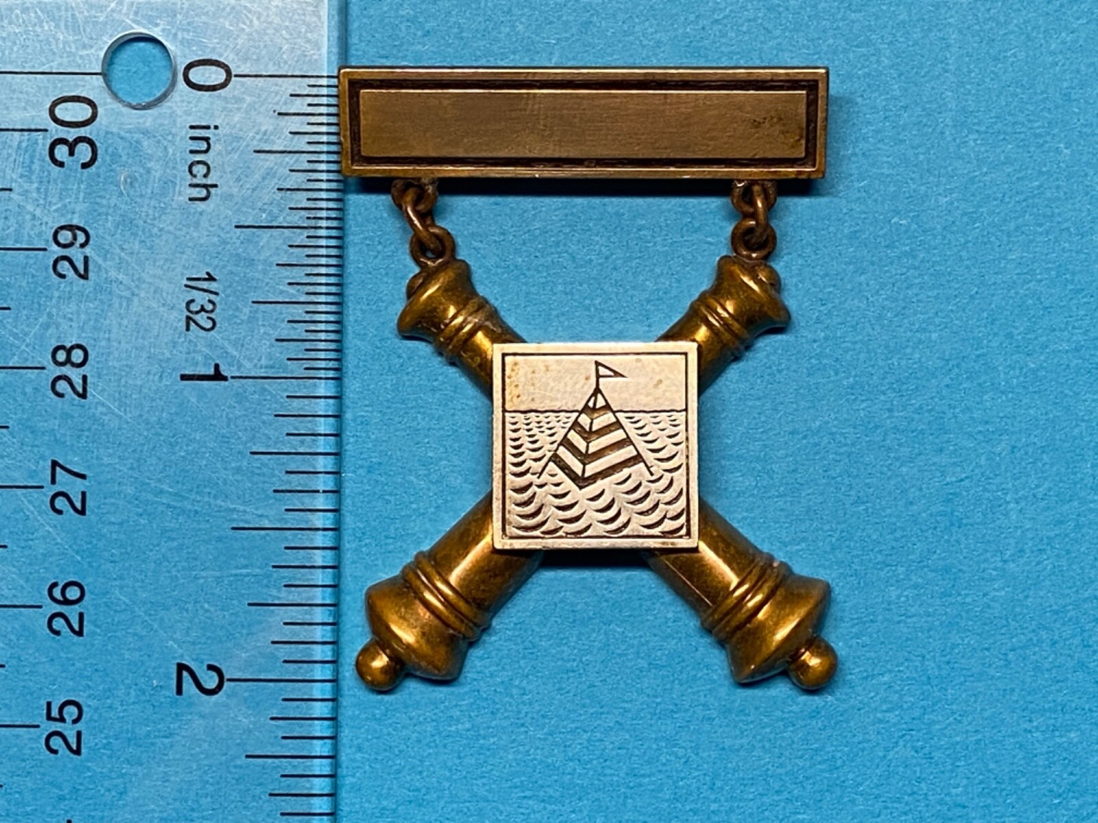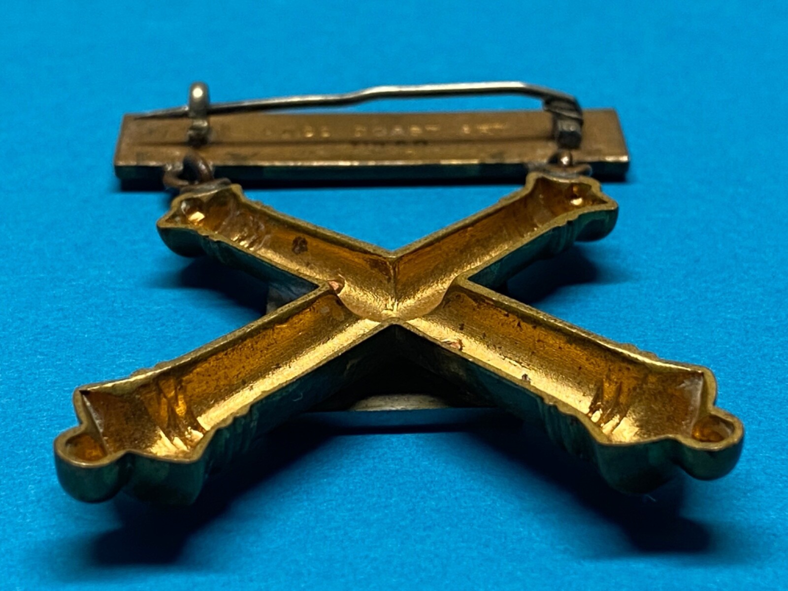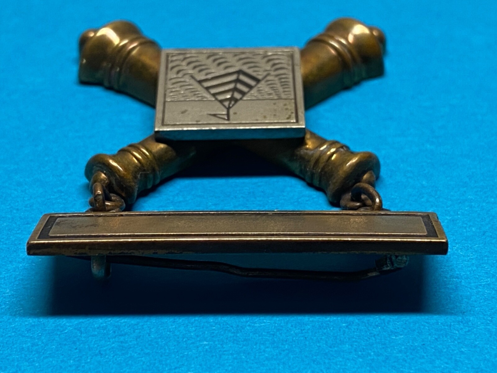 Made by Rock Island Arsenal, Illinois. Depicts two yellow gold cannons crossed at 90 degrees, each weapon slightly over 1.9 inches in length, with a silver-colored center square .65 inches on a side. This square bore a floating target remarkably similar to Captain Lyon?s never used 1891 gunner?s button. This entire badge is suspended from a black-edged brass rectangle. Production numbers are unclear, but the initial order placed in 1903 was for 1,700 badges, By 1906 Rock Island Arsenal reported a remaining stock of 525 Coastal Artillery Corps Badges, and there was no evidence of a reorder. This badge is in fine condition with a great deal of the original bright finish. This qualification badge is 120 years old.