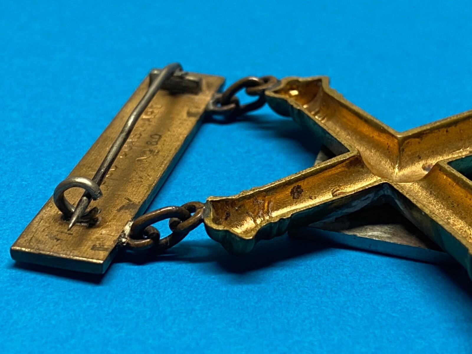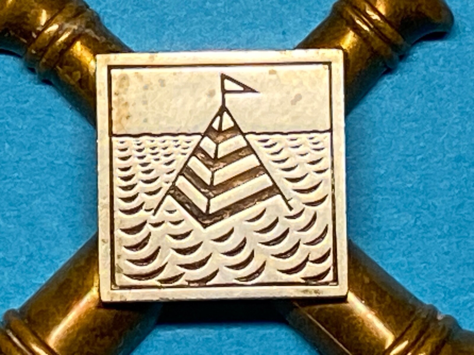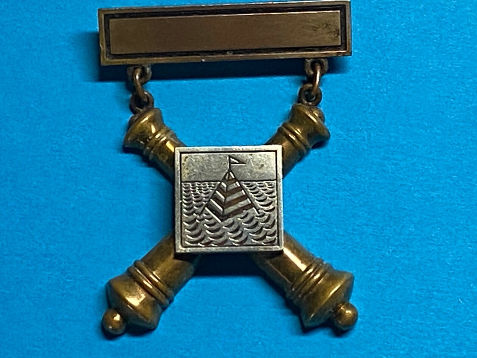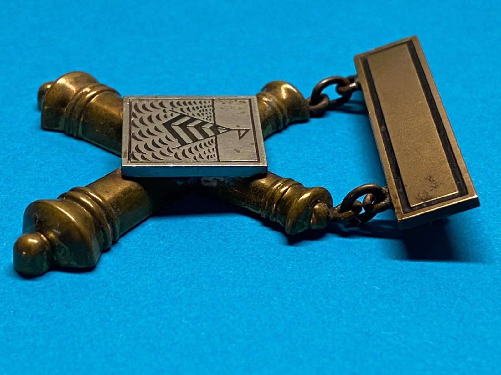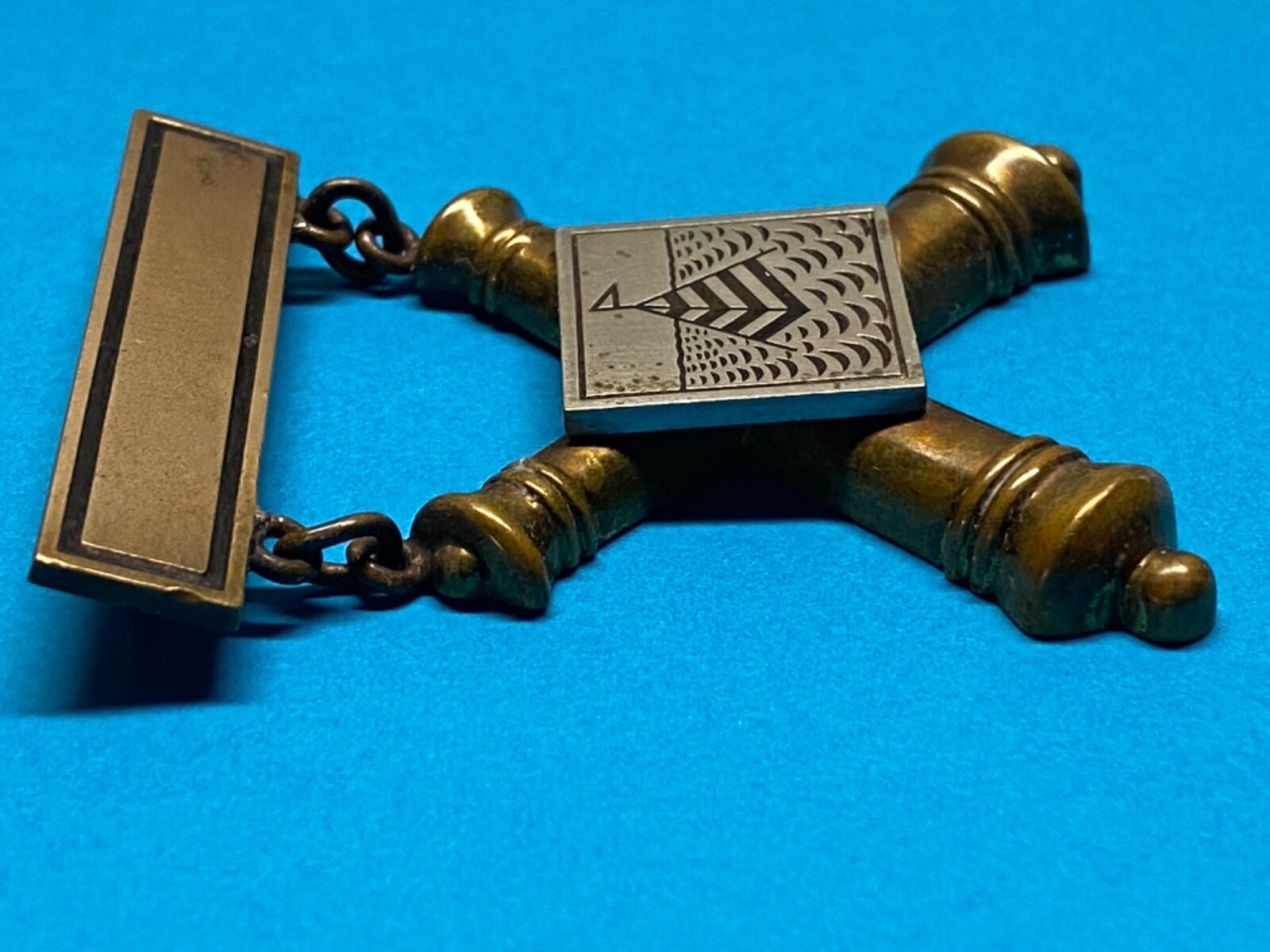 Made by Rock Island Arsenal, Illinois. Depicts two yellow gold cannons crossed at 90 degrees, each weapon slightly over 1.9 inches in length, with a silver-colored center square .65 inches on a side. This square bore a floating target remarkably similar to Captain Lyon?s never used 1891 gunner?s button. This entire badge is suspended from a black-edged brass rectangle. Production numbers are unclear, but the initial order placed in 1903 was for 1,700 badges, By 1906 Rock Island Arsenal reported a remaining stock of 525 Coastal Artillery Corps Badges, and there was no evidence of a reorder. This badge is in fine condition with a great deal of the original bright finish. This qualification badge is 120 years old.