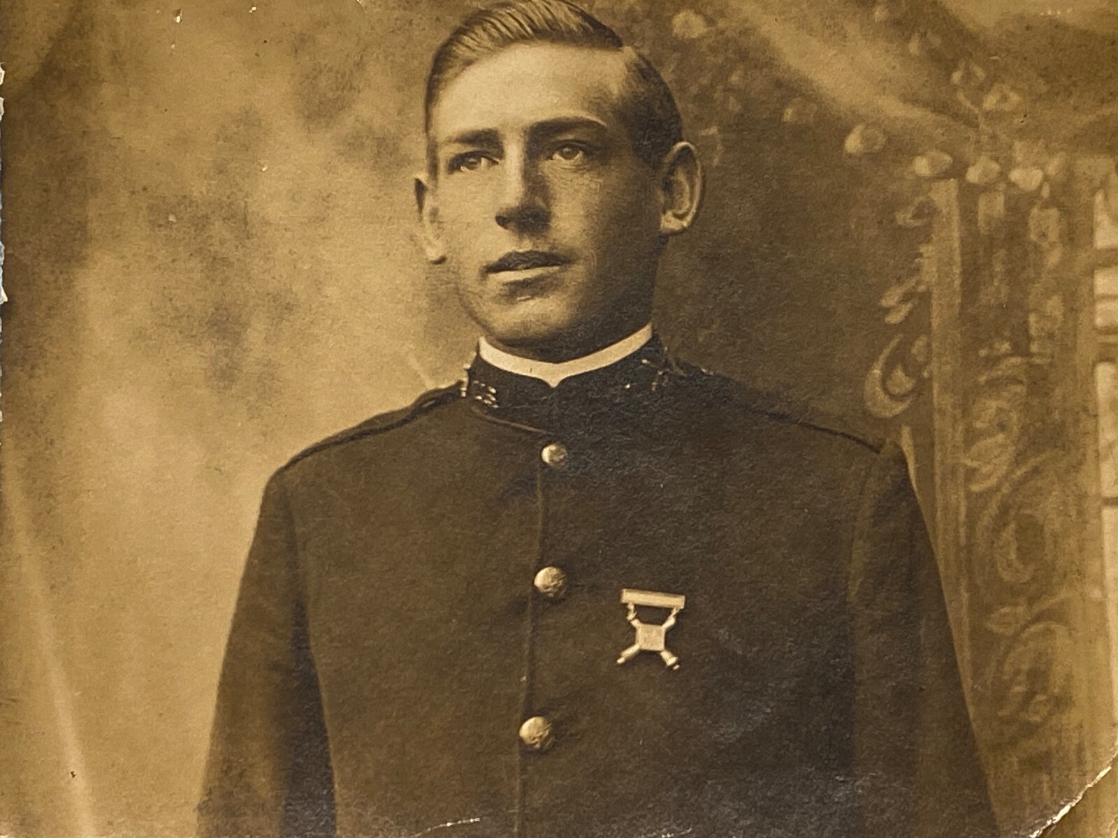 The black and white photograph is not included and is being used to display how the badge was worn.