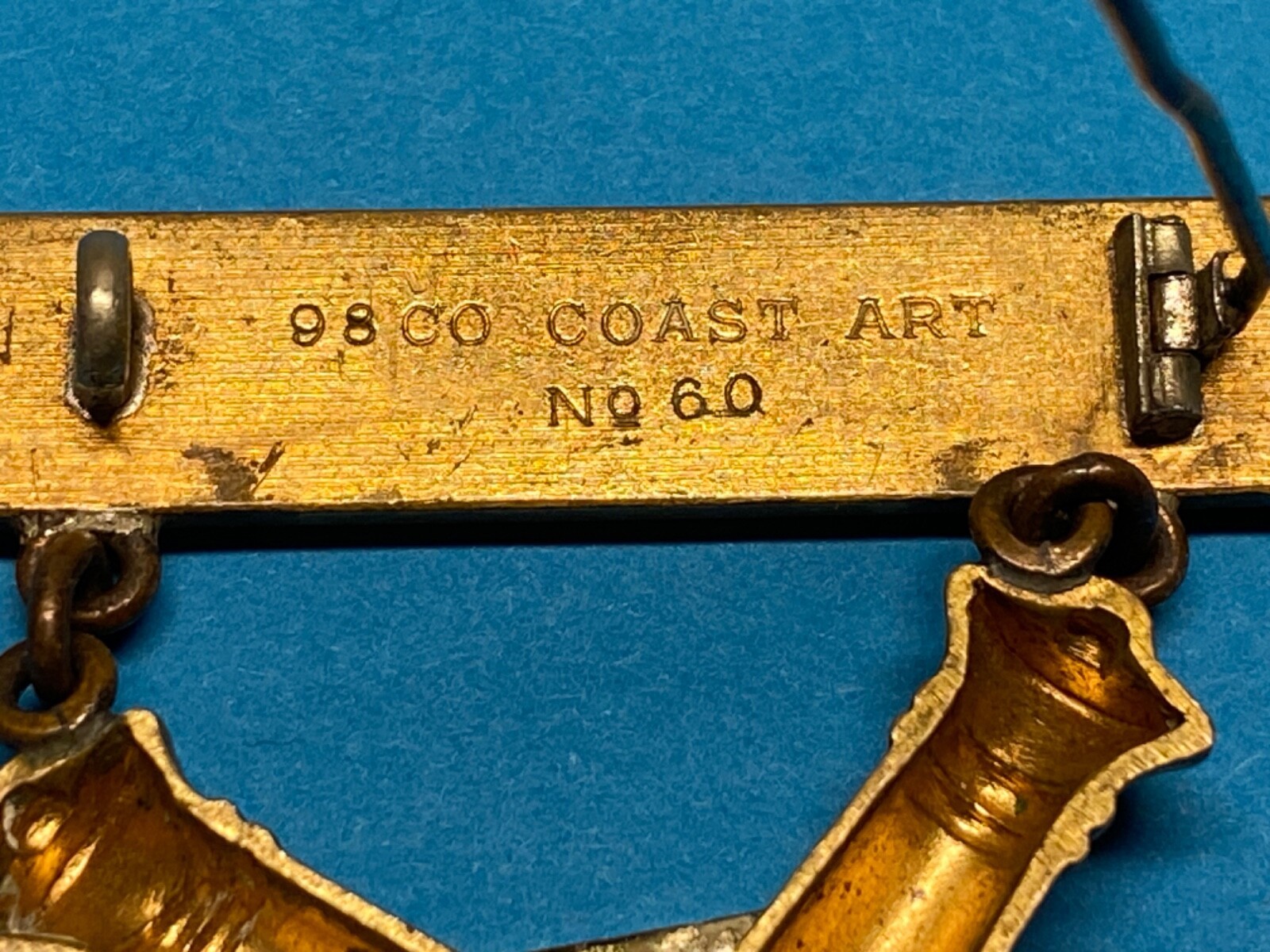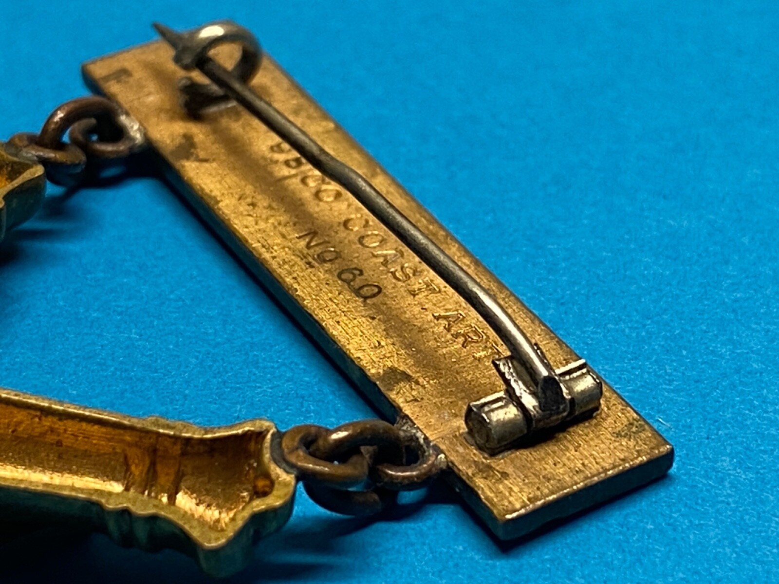 Before issue, Rock Island Arsenal stamped all Coast Artillery Badges on the reverse of the rectangular brooch with the unit?s name, as in this case 98 CO COAST ART? on the top line and the owner?s unit on the second line, as in this case N0 60. The soldiers Company number was the means of identification of his web gear and lathe items which was unique to his Company.
