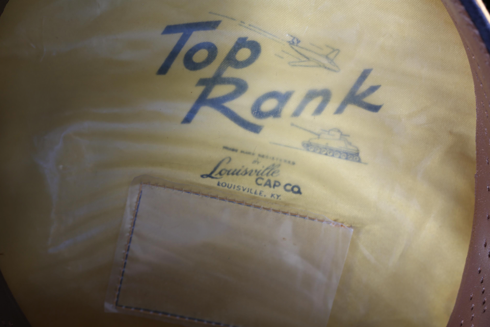 This is not one of the Pakistan reproductions. Made in the U.S.A. by Louisville Cap Company which closed its business in 1975. Marked size is 7-1/8. Medical Officer Cap Band. Double Air Vent Gromets on each side are intact. Leather sweat band is supple. Original gold toned cap device is intact. Marked size is 7-1/8.