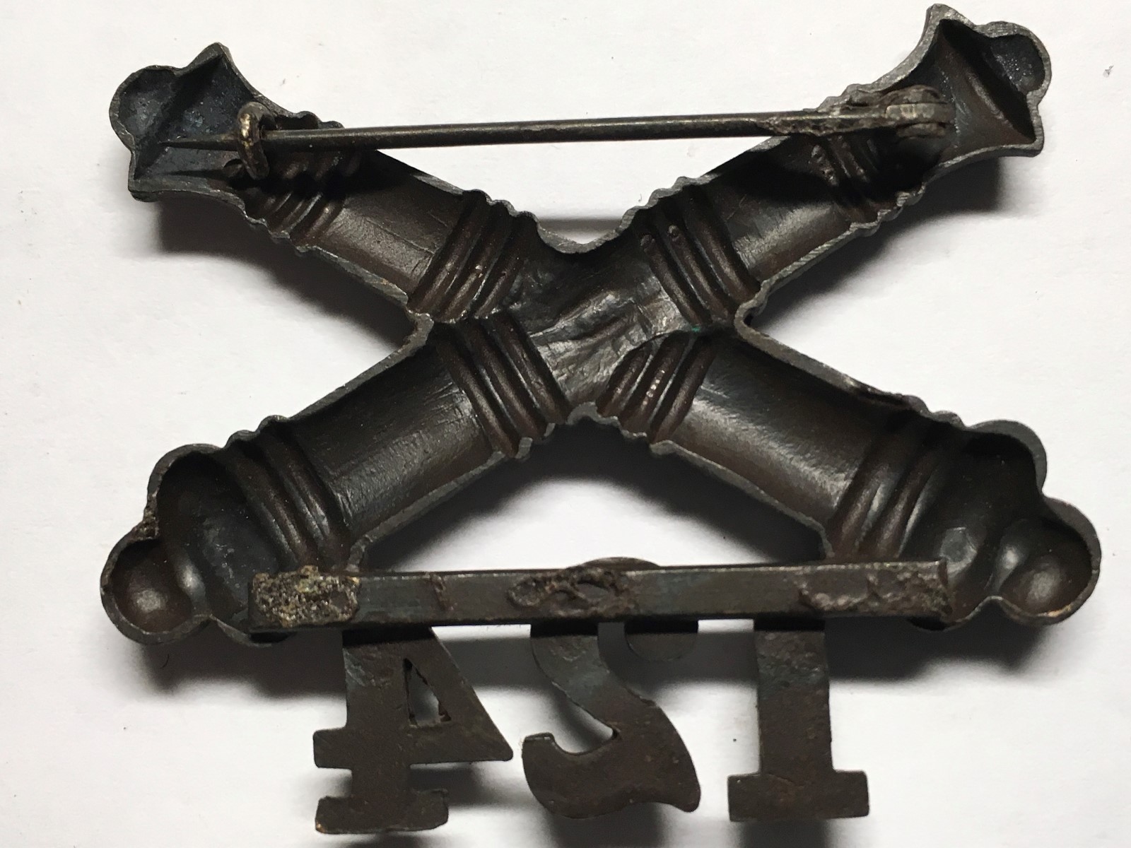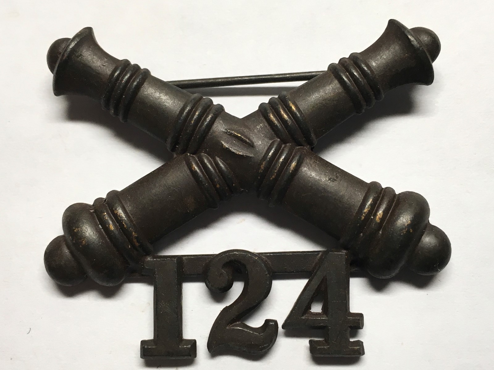 CIRCA 1902-1905, U.S. ARMY ARTILLERY CORPS, BRONZE, 124th FIELD ARTILLERY, ENLISTED, SERVICE COAT INSIGNIA