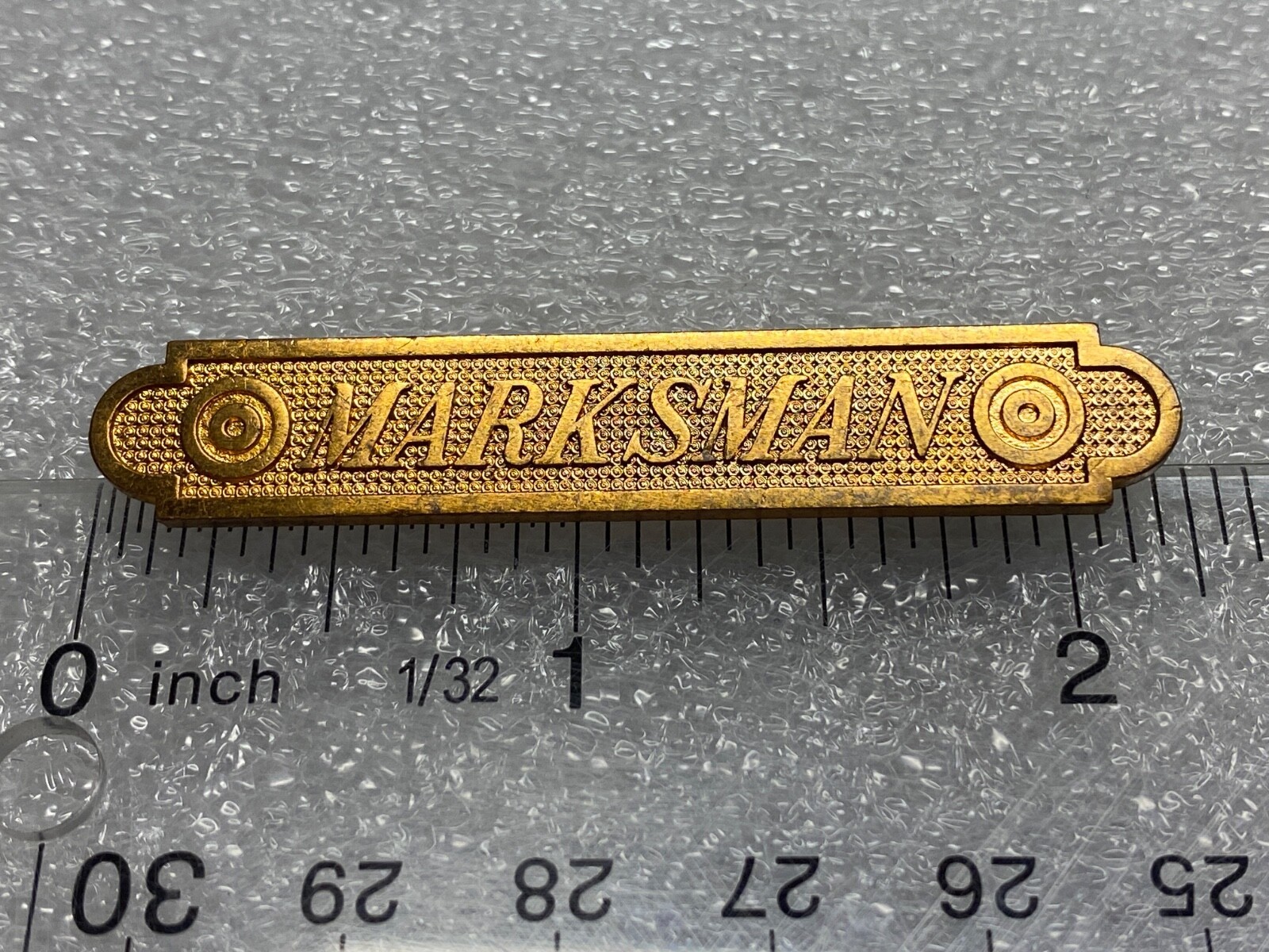 The U.S. Army issued this style of silver bar for rifle marksman. During 1918 and 1919 the military officially suspended issue of metal shooting badges and substituted a cloth sleeve insignia, however, soldiers ignored the prohibition and wore badges which were made by private companies. In the early twentieth century the War Department authorized gold colored badges for the National Guard troops. Qualifications requirements for the gold colored badges were slightly less than for the silver versions.