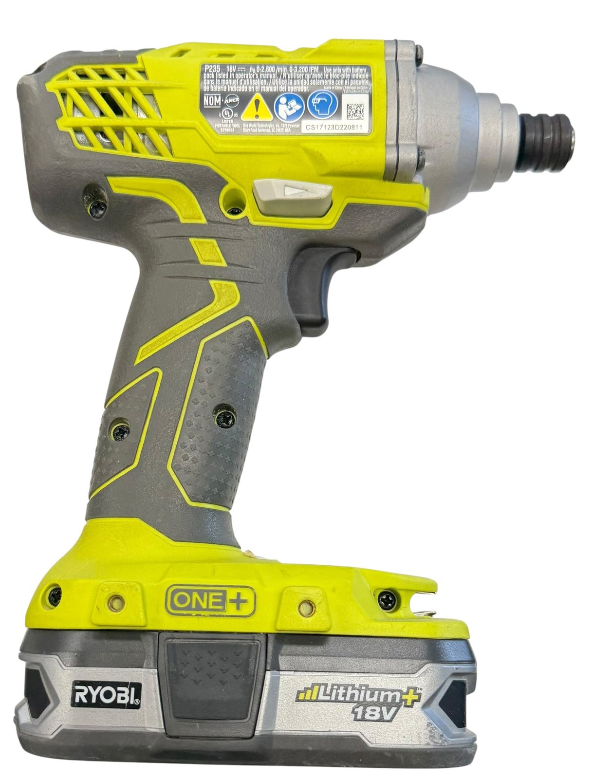 Category: Cordless hand toolsType: Impact DriverBrand: RyobiModel number: P235Size: 18VColor: GreenPower source: BatteryBattery Included: yesCase included: noCharger Included: noVoltage: 18VNumber of pieces: 2Model name: Impact DrillCondition:Used