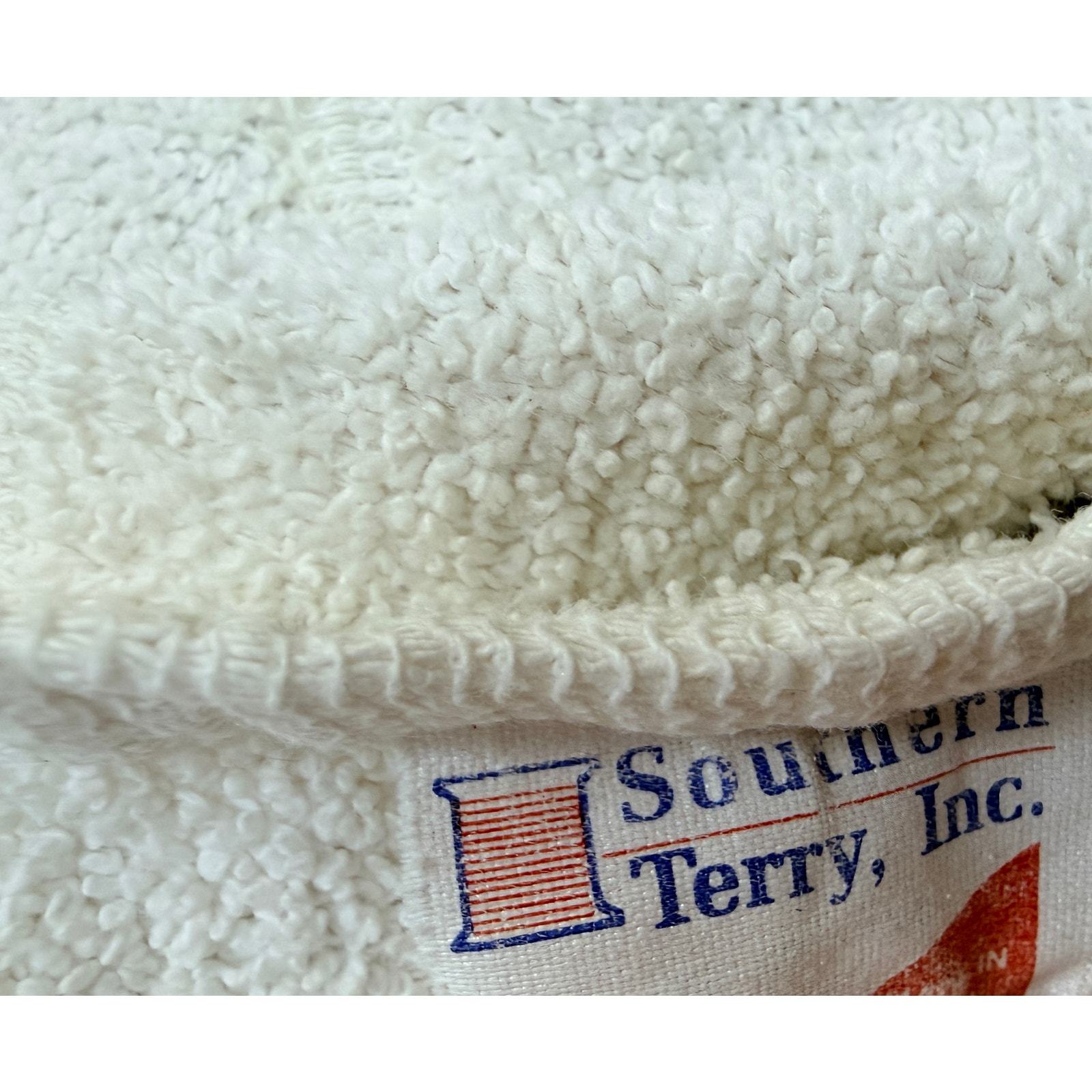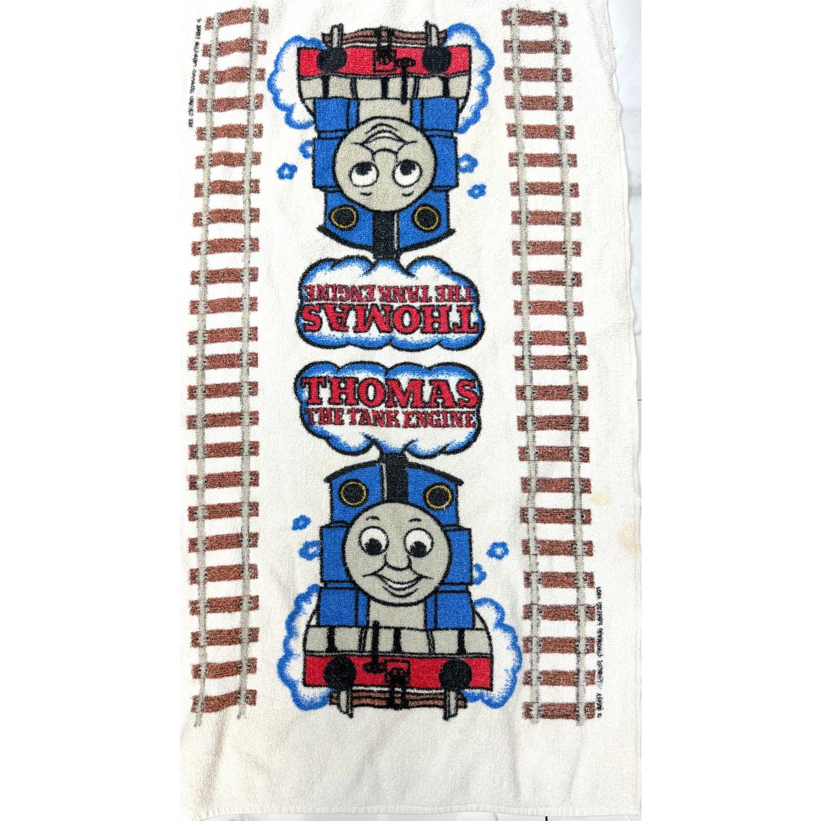 Cheerful and nostalgic Thomas the Tank Engine terry towel from the late 1980s?early 1990s. Made in the USA by Southern Terry, Inc., it features bright licensed graphics of Thomas with train track borders. A fun collectible for Thomas fans, vintage textile collectors, or as retro nursery/bathroom decor.
