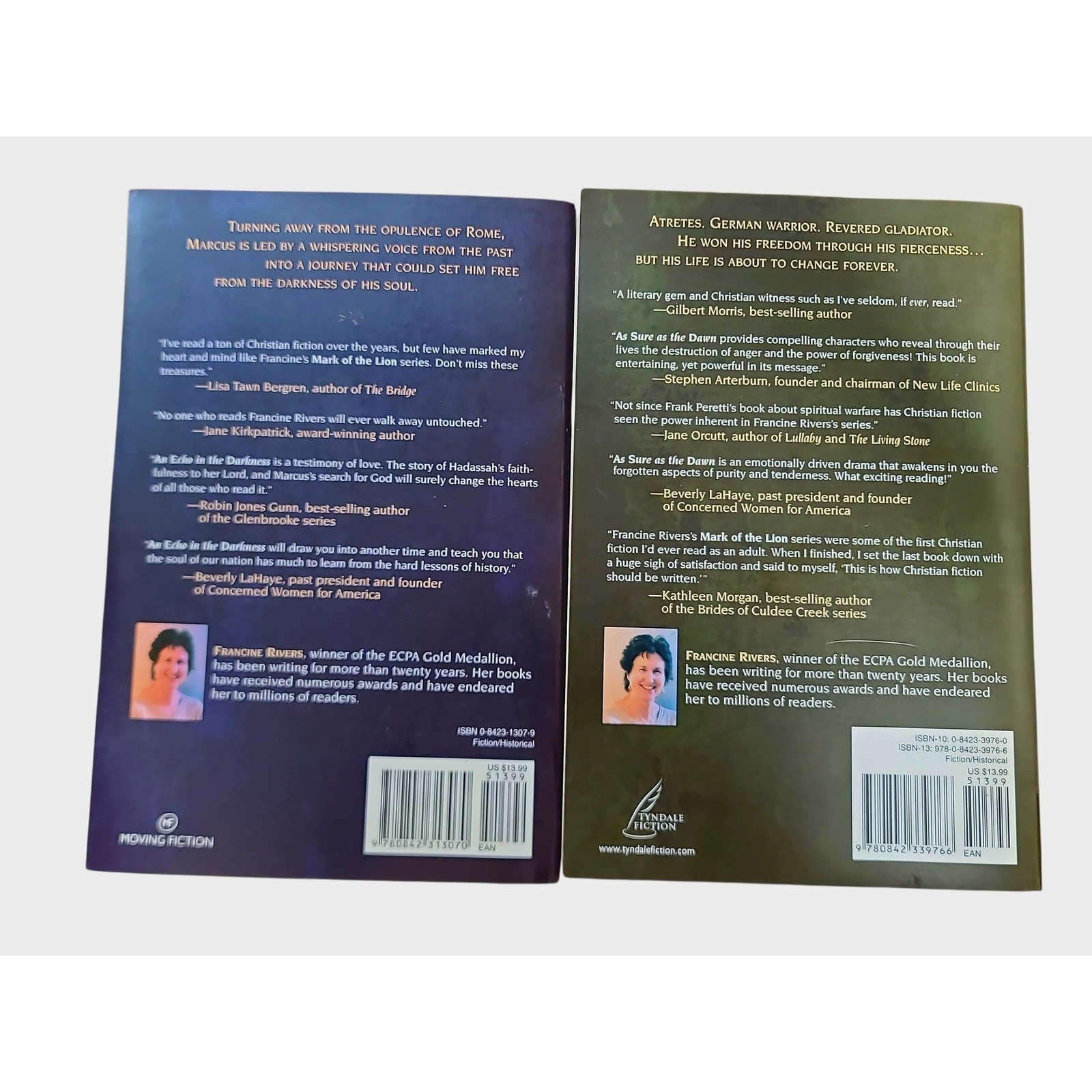Dive into a captivating historical journey with this Francine Rivers Mark of the Lion book set, featuring "An Echo in the Darkness" and "As Sure as the Dawn." Both novels weave intricate tales of love, redemption, and faith against the backdrop of ancient Roman times. Discover compelling characters navigating trials and triumphs in these engaging narratives, enhanced with profound insights and richly detailed settings. Perfect for readers seeking an inspiring and thought-provoking escape, these books are ideal for cozy evenings by the fireplace or enriching book club discussions, allowing you to explore themes of courage and transformation.