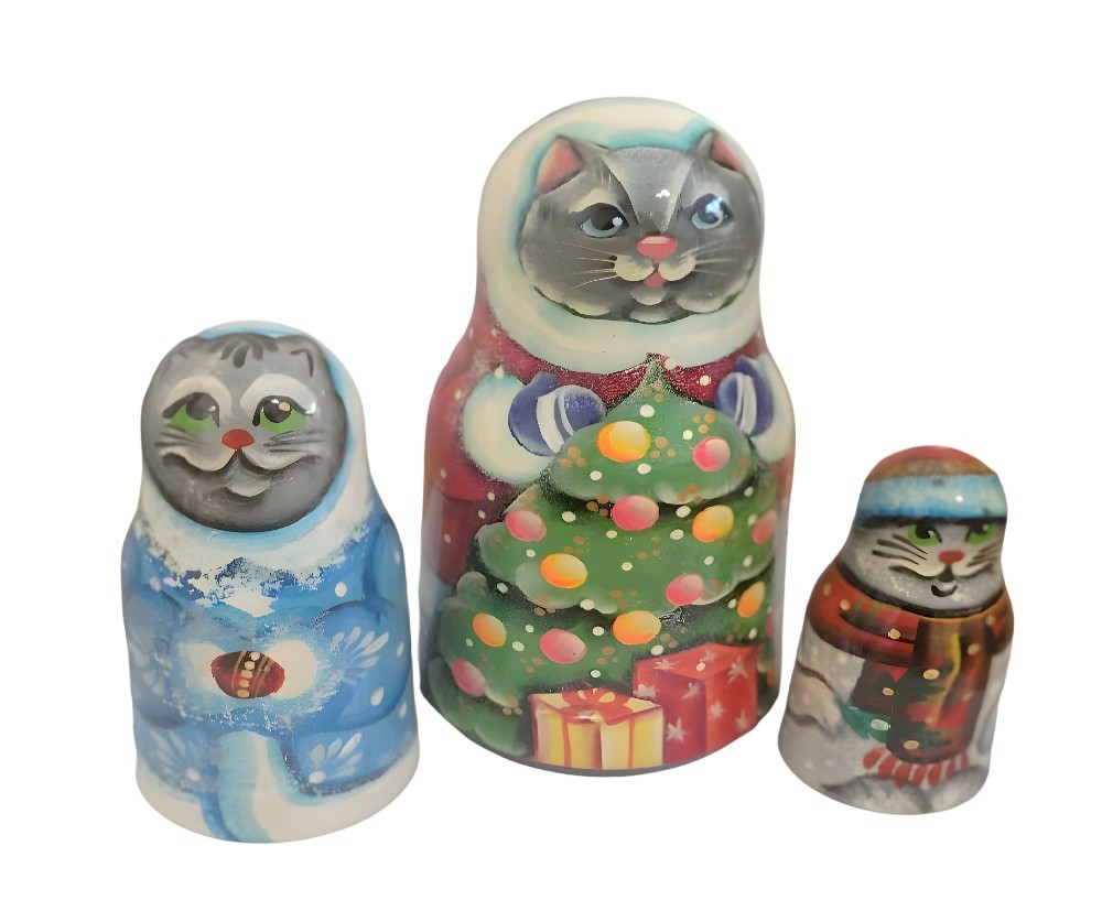 This product is a set of 5 pcs hand-painted Russian nesting doll featuring a Christmas cats theme. The largest doll stands at 7.25 inches tall and is made of wood. Each doll is intricately designed with cats as the character, making it a unique and charming addition to any doll collection or as a decorative piece for the holiday season. Made in Russia.