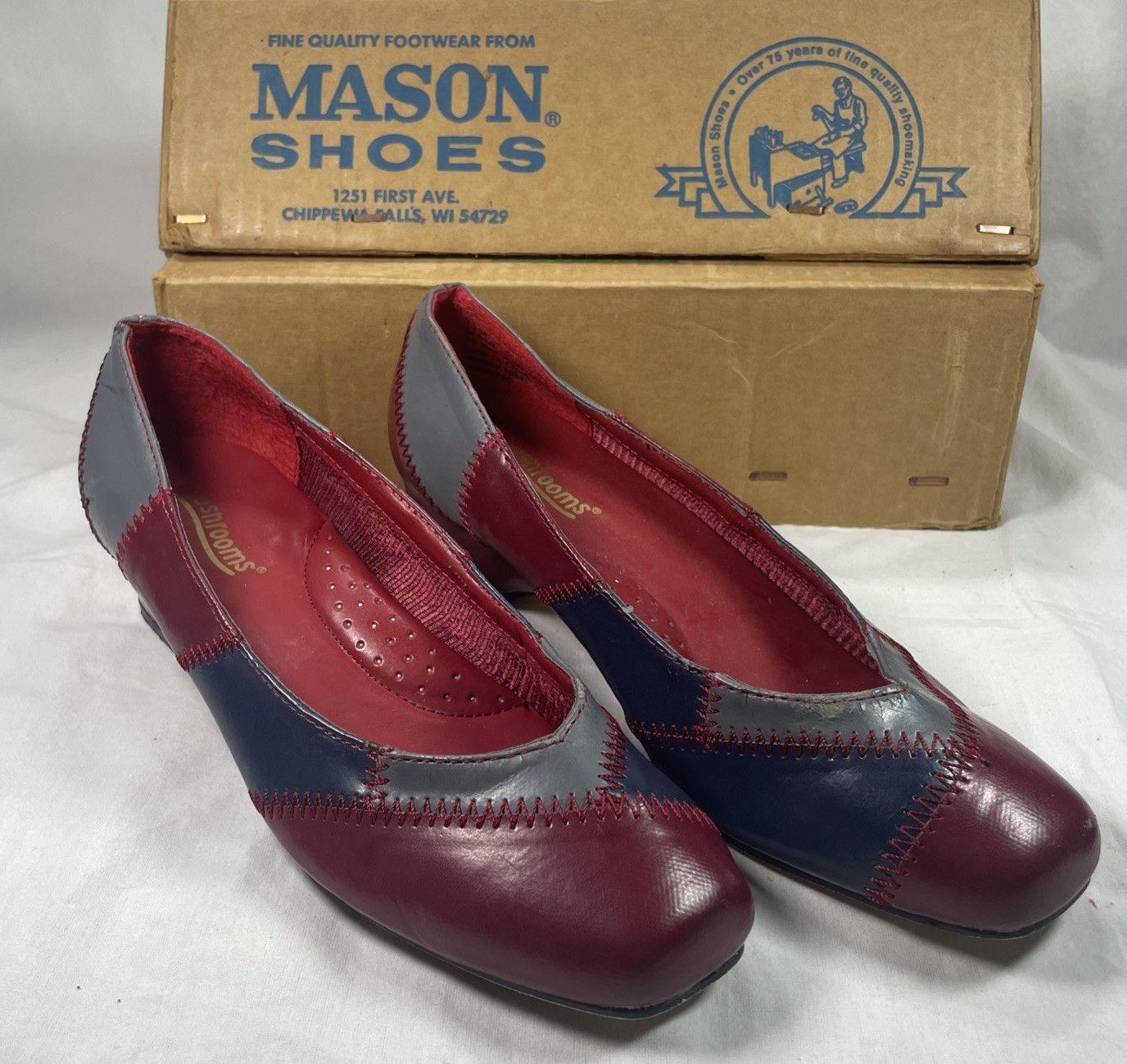 The product is a pair of MASON leather multicolored low heel pump dress shoes in size 7 1/2 M. These stylish shoes feature a round toe, low heel, and classic pump style. Made of leather with a medium width, they are perfect for dress occasions and provide both comfort and fashion for women looking to add a touch of elegance to their outfits. The multicolor design adds a unique and trendy touch to the overall look, making these shoes a versatile and chic choice for any wardrobe.