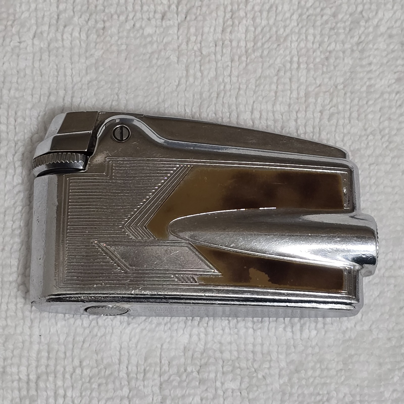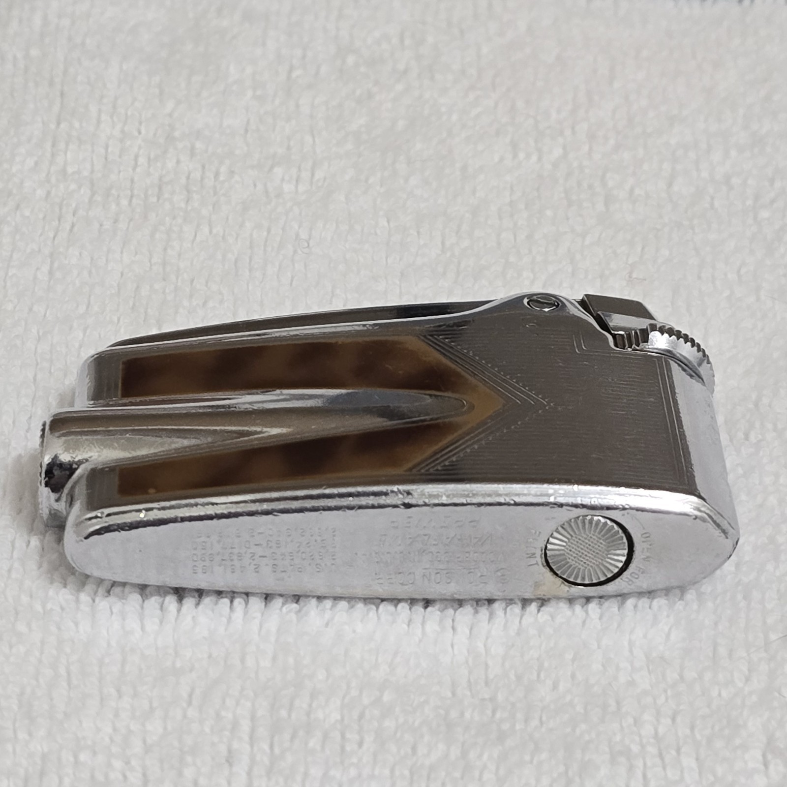 Chrome-plated body with tortoise shell enamel inlay panels
