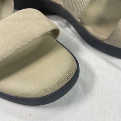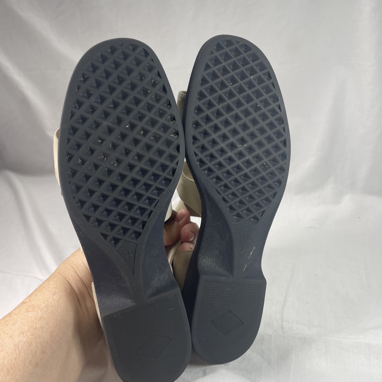 Pre-owned criss-cross Sandals with leather sole and suede heel and toe area. They are older and have some warn areas. See pictures. But, they still have some good wear left in them.