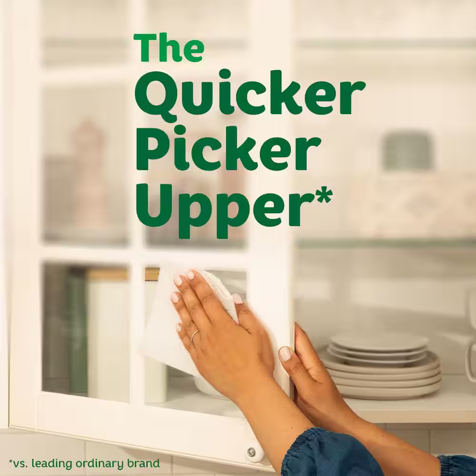 Spilled your drink. Quick! The Quicker Picker Upper. Be ready to tackle messes and spills with Bounty Paper Towels! Each sheet is 2x more absorbent, so you can use less and pick up spills and messes quicker than the leading ordinary brand. That's why Bounty is the Quicker Picker Upper! Bounty Paper Towels are available in 2 sheet sizes, Full Sheet and Select-A-Size, so you can choose which option works best for you. Bounty Select-A-Size towels are versatile, so you can choose your sheet size depending on your mess. and if you're buying the bigger packs, you'll always have Bounty on hand. Bounty has a variety of pack and roll sizes to fit your needs. Bounty products are proudly made with American jobs and we're fully committed to creating solutions for a sustainable future. Across all our products, we consider the impact on people, forests and the world. That's why for every tree we use, at least 2 are regrown so you can conveniently and confidently clean messes in the kitchen and around the house knowing Bounty Paper Towels is helping to keep forests greener. Bounty always has your back in and out of the kitchen so whether it's juice on the counter or ice cream on the table, we make sure spills won't stand a chance. vs. leading ordinary brand.