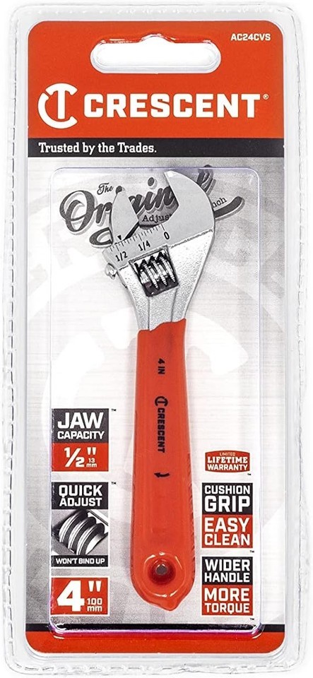 Crescent adjustable cushion grip wrenches feature a durable, comfortable, plastic grip on the wide handle. A large knurl allows for easy adjustment and a tight-fitting hex jaw design reduces slippage and tightly grips the fastener for solid, secure operation. The corrosion-resistant chrome finish helps prevent rust