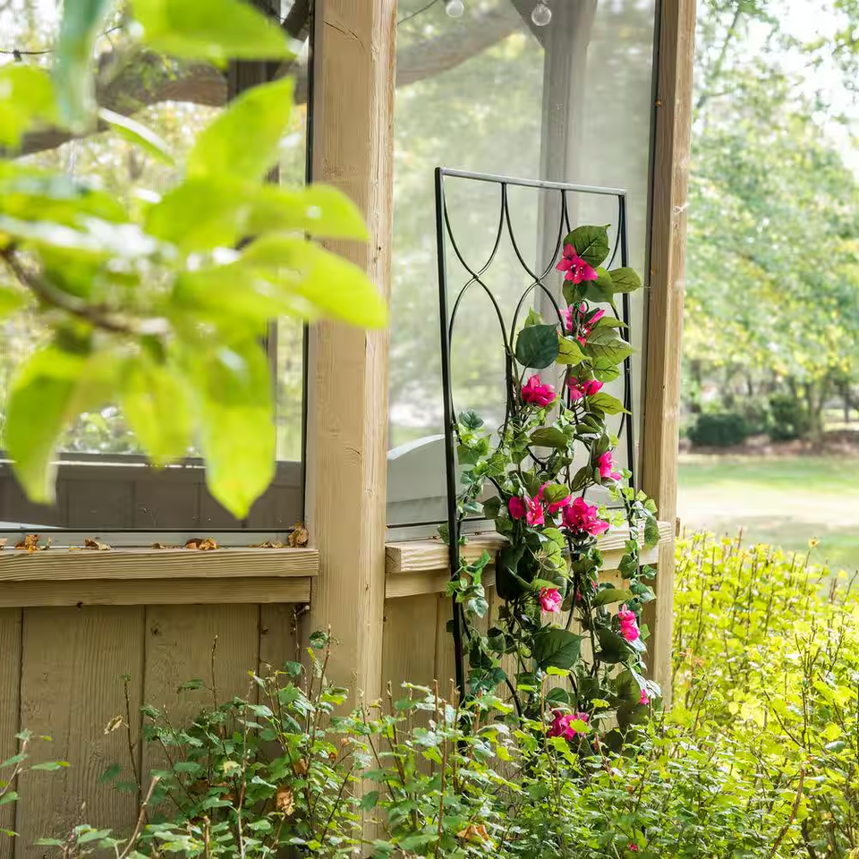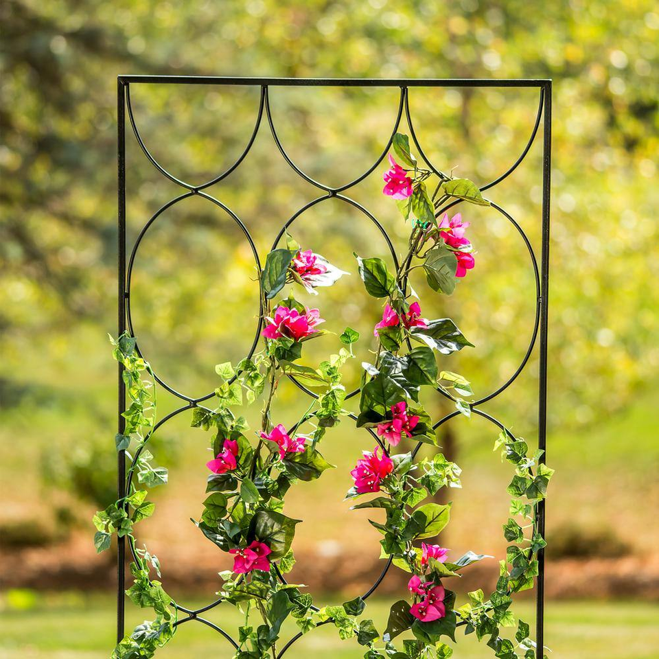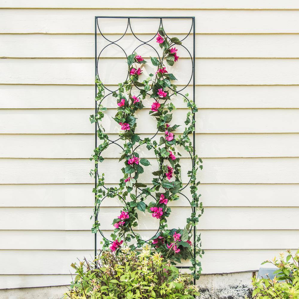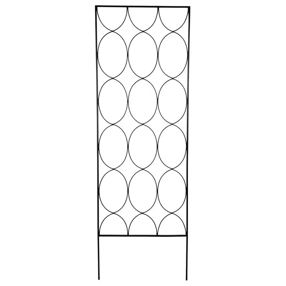 The round patterned design of the Vigoro Geometric Trellis brings modern style to your outdoor space, even before your plants start climbing up the structure. This garden trellis provides a solid structure to support and display climbing plants like clematis, ivy, sweet peas, and more. The modern trellis is made from strong welded steel. The black powder-coated finished helps resist rust and weathering. The freestanding metal trellis is 72 in tall and 24 in wide. You can easily install this metal trellis for climbing plants by pressing the pointed tips fully into firm soil. Tip: If soil is hard or frozen, do not force the ground stake into position. Use warm water to moisten or thaw the soil. Do not use your foot to push as this could damage the trellis.