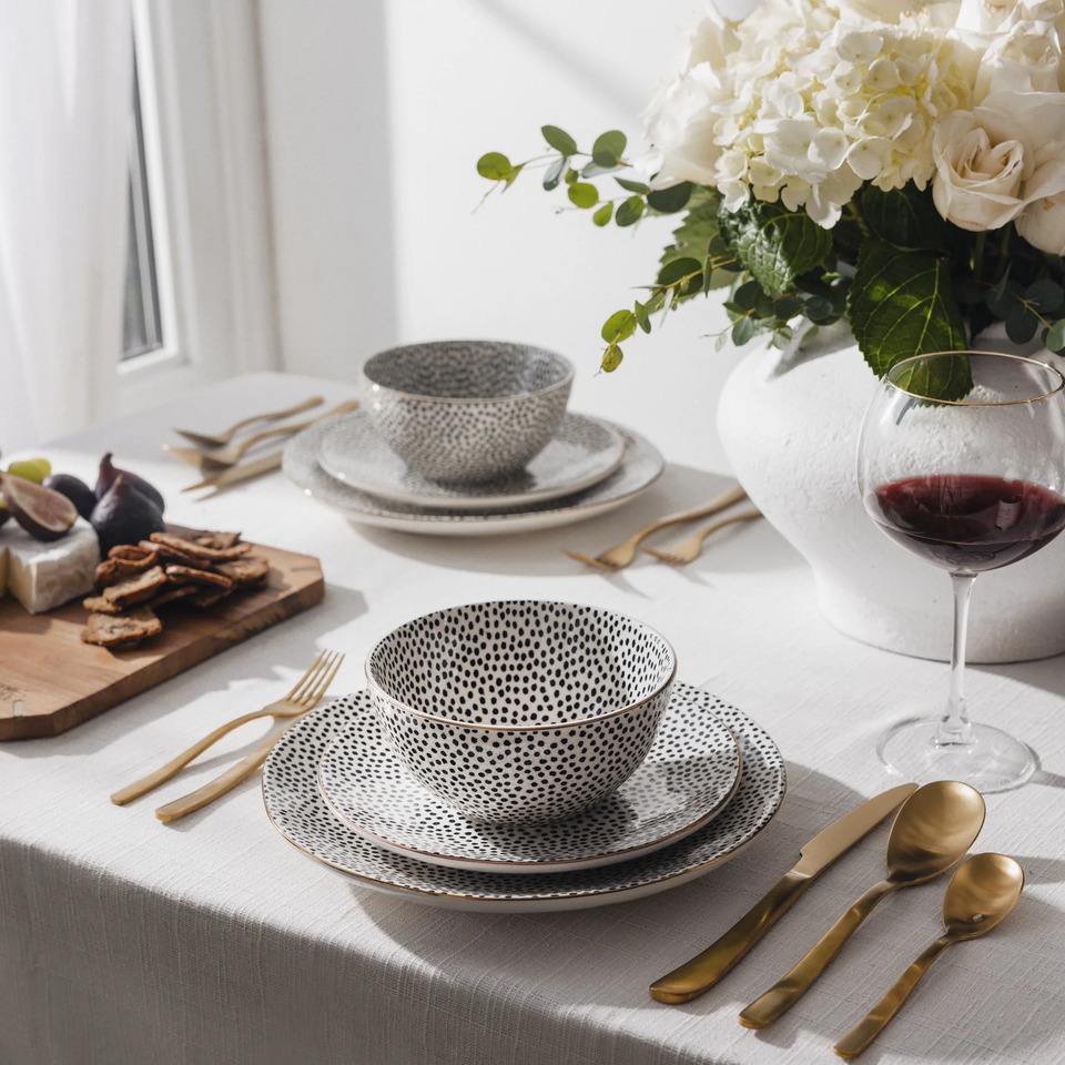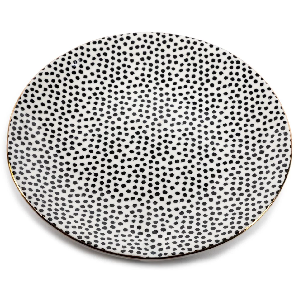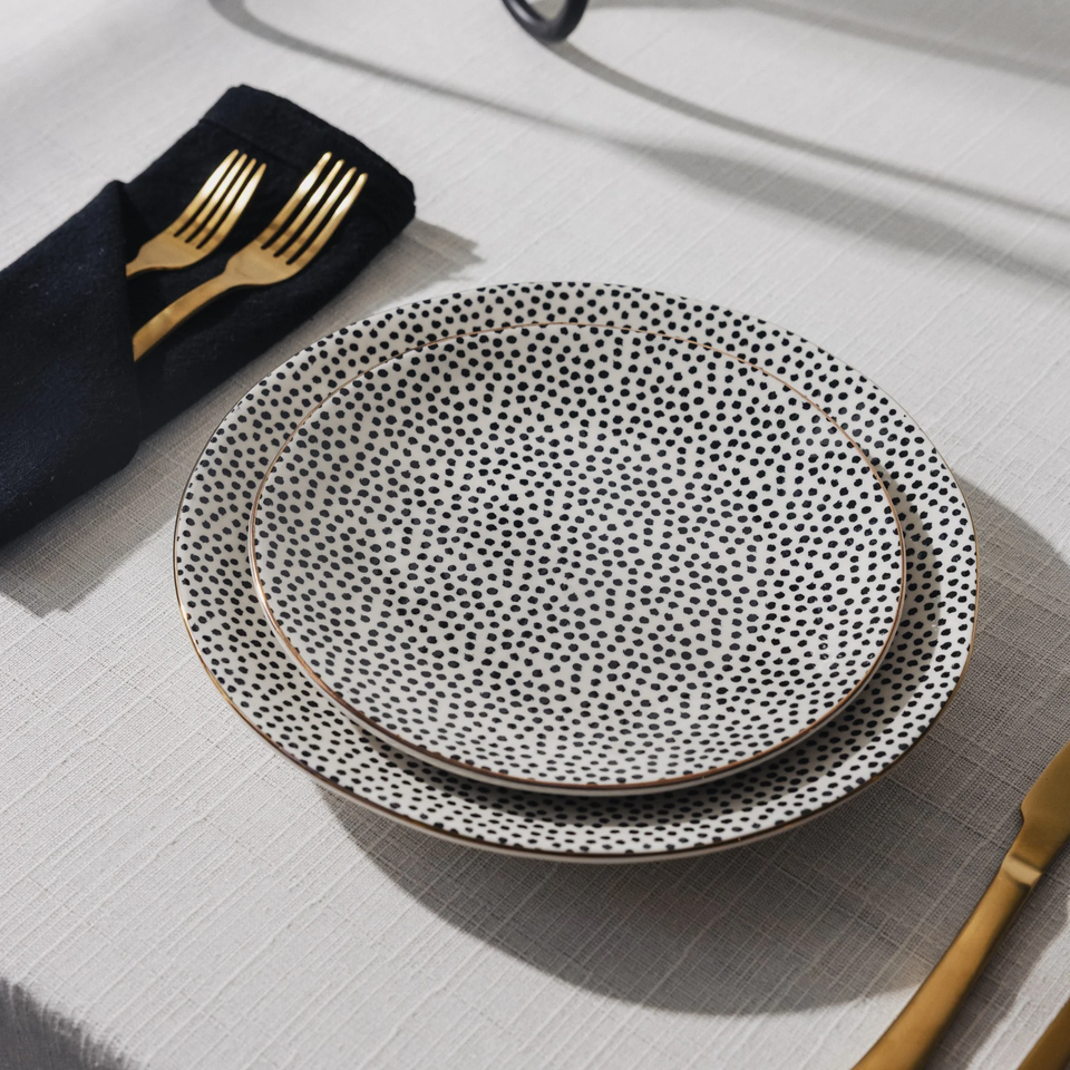 Thyme Table Dot Ceramic Salad Plate Black and White Stylish Design: Bold black and white pattern with an elegant gold rim Durable Ceramic: Made for both everyday meals and special occasions Versatile Use: Perfect for salads, starters, or sweet treats Microwave Safe: Convenient for quick reheating Dishwasher Safe: Designed for everyday convenience and effortless cleanup