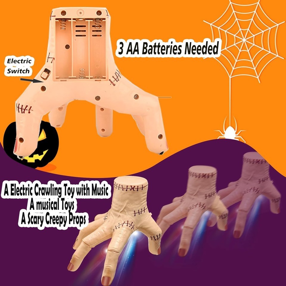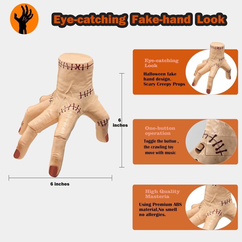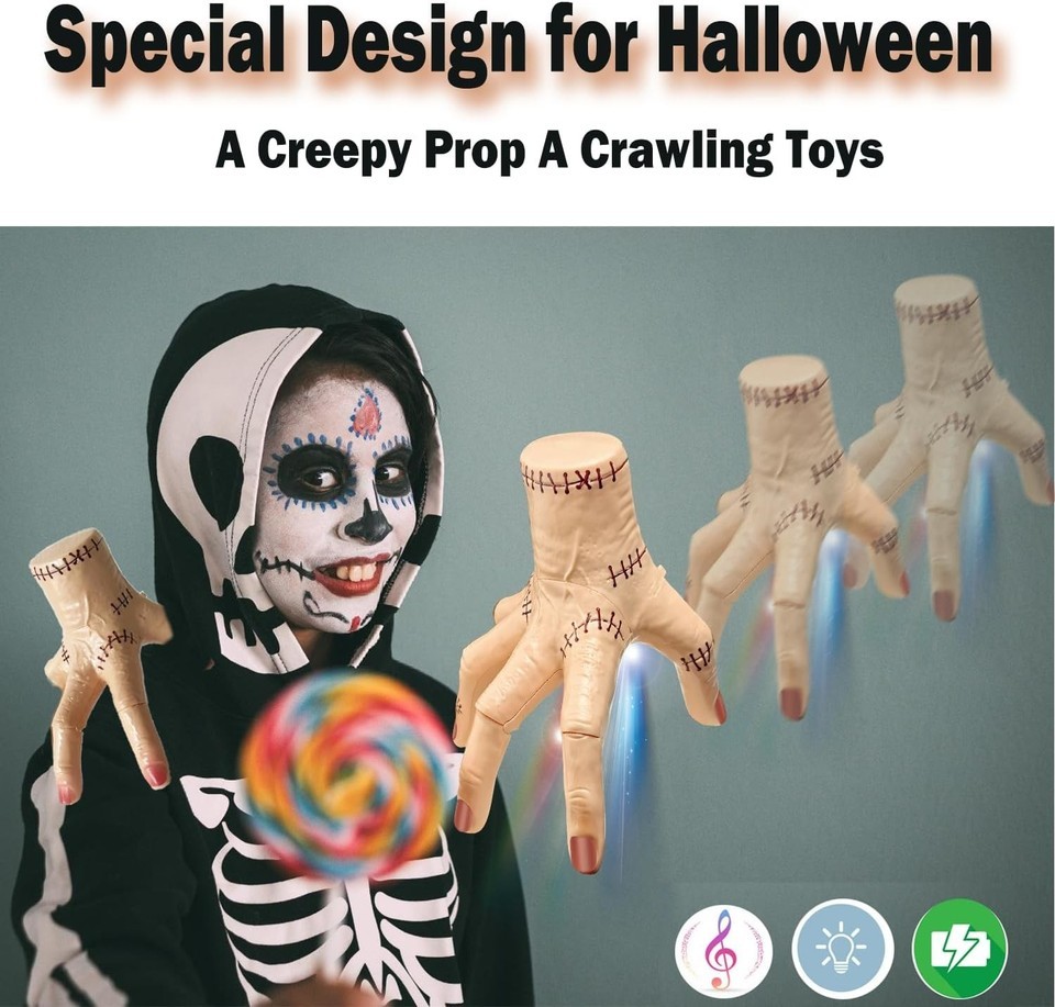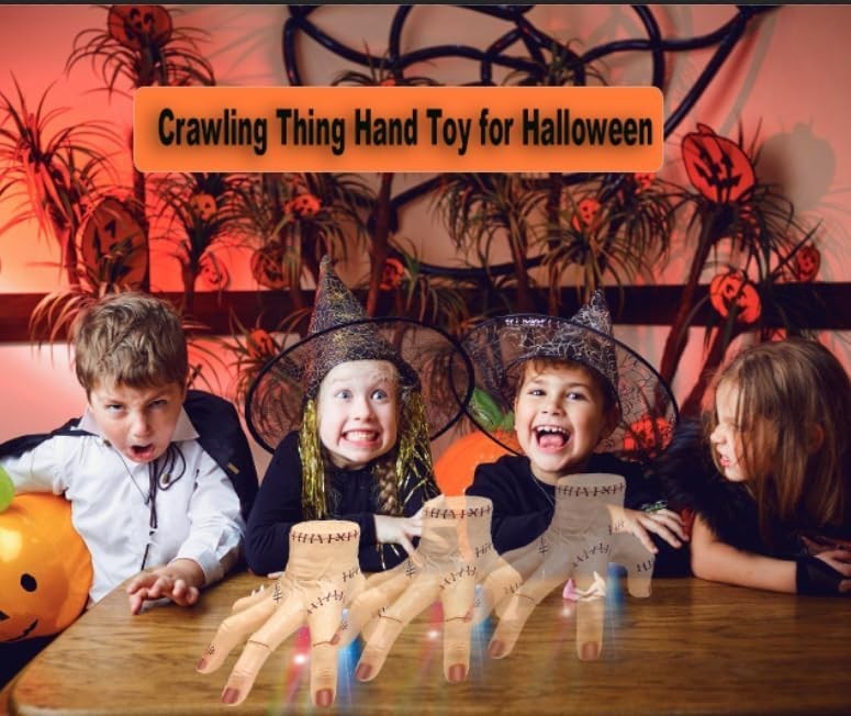 ?Sound/Flashing Lights/Crawling Creepy Toys?The halloween Fake Thing hand not only a creepy props.it is also a sound/flashing lights/crawling creepy toys for kids.It offer colorful flashing lights and Halloween atmosphere music,add more fun for Halloween.