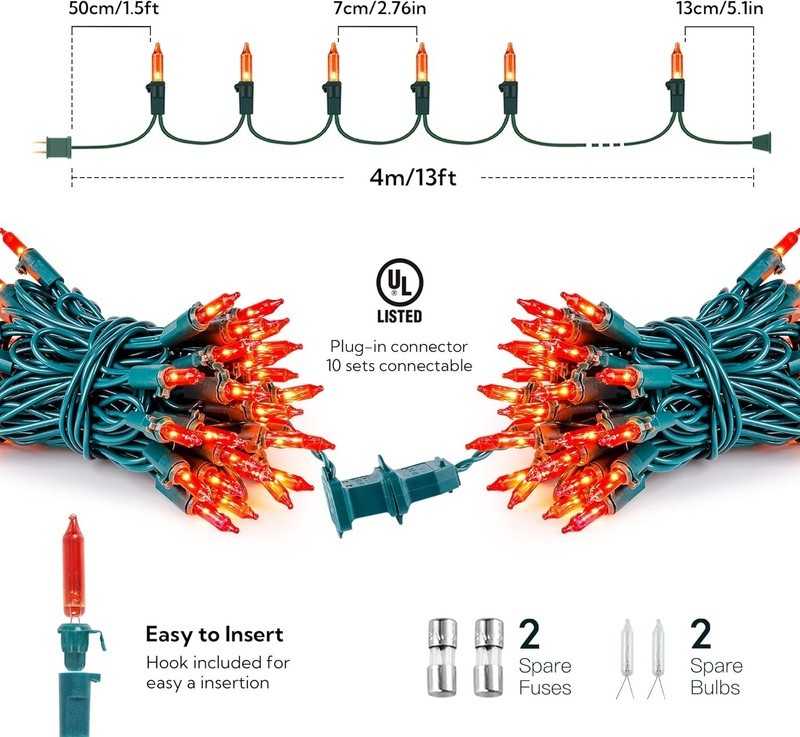 ?Green wire wire Thaksgiving mini Lights:MYGOTO clear incandescent Autumn fall string lights with 2 pack 50Count Orange Lights,13feets length and each set includes 4 Extra Bulbs 4 Spare Fuses.Perfect for any indoor and outdoor decor.