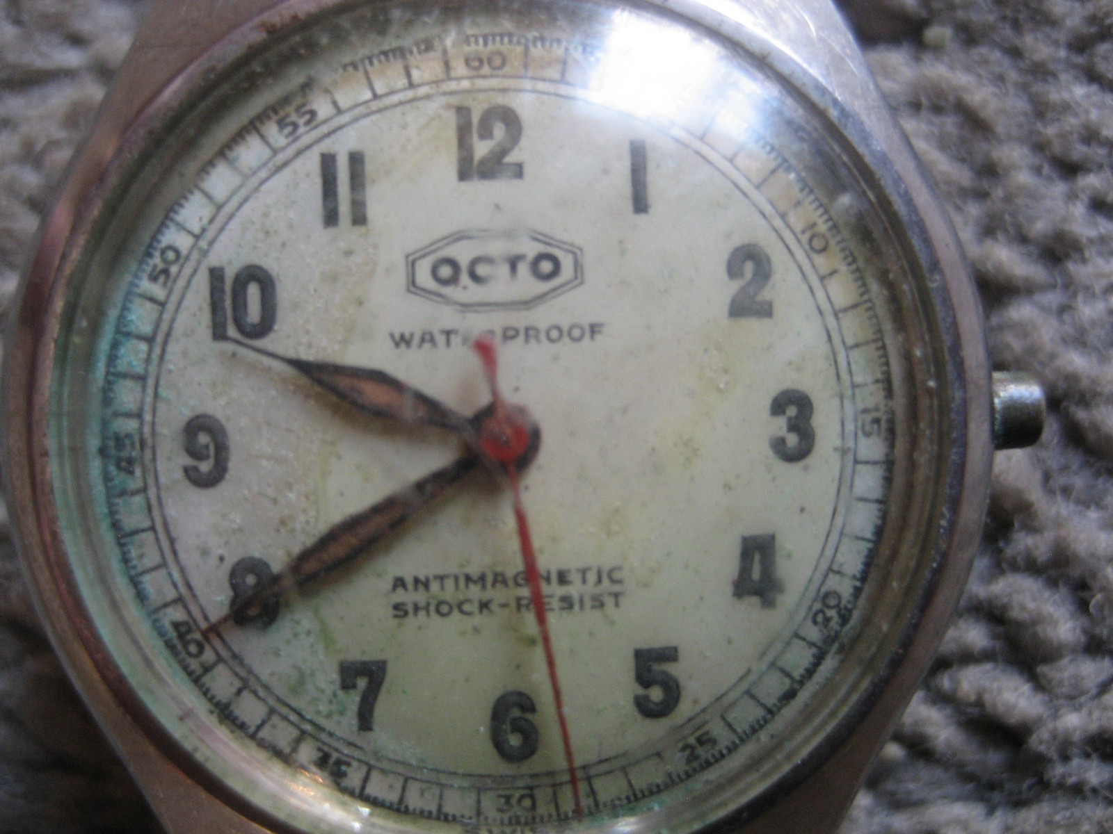 Vintage Octo Swiss Made waterproof Watch WWII "Reserved" Steel w/ Azium Steel band This is a great and RARE watch from Octo. hard to find these out there. ** This does tick, but stops from time to time. This will need repair. If you know how to repair these, it is probably an easy fix. But I cant guarantee this. Sold as Non-working watch.** Got this watch at an estate sale with lots of other antiques. This is an OCTO - Swiss. Weight is 46.4 grams. Serial number on case is 48447 We are not experts in old watches, but we can try to answer your questions. Will ship international! Will answer questions.