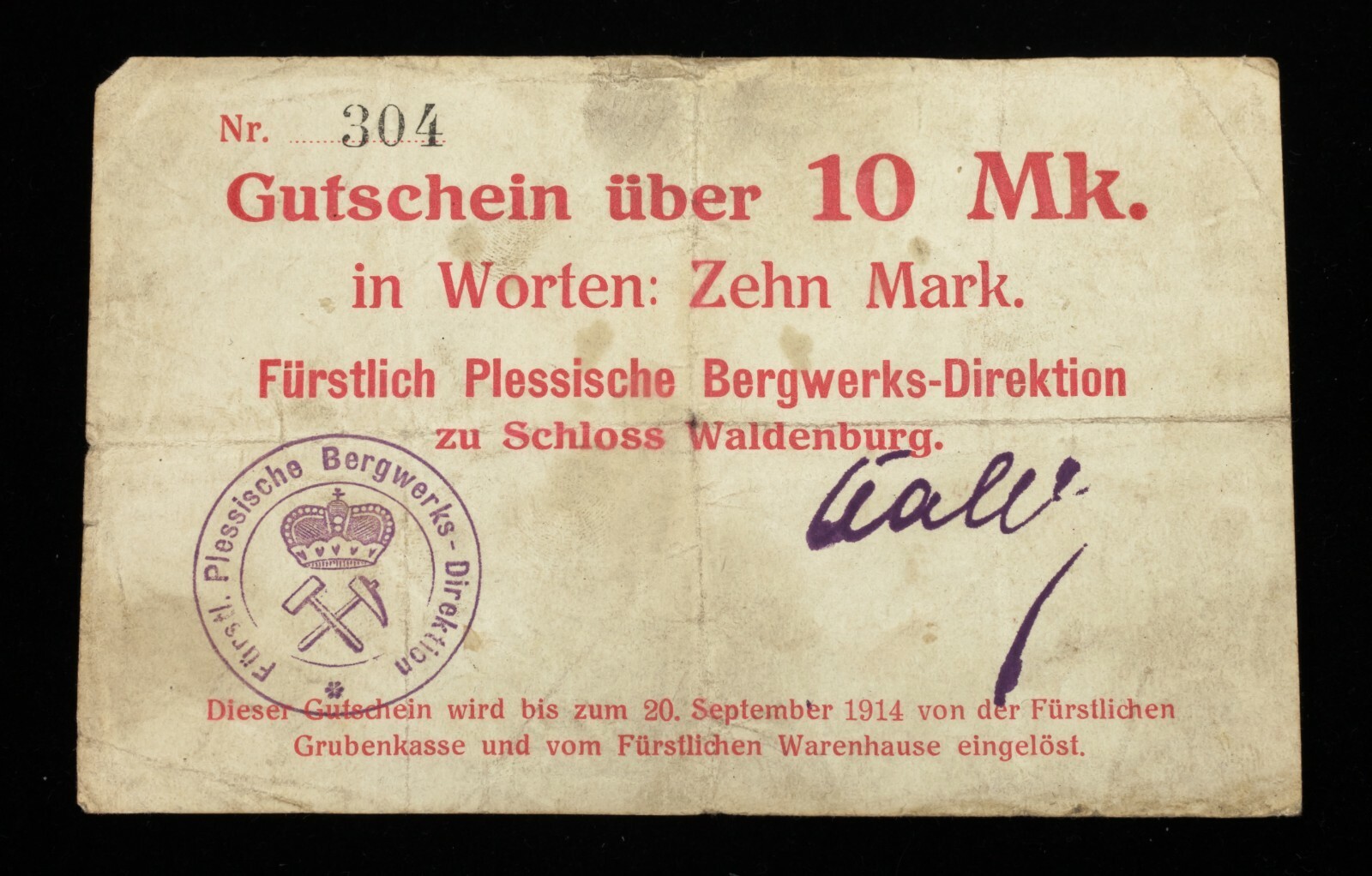 1914 Waldenburg 10 Marque, tres fin (VF), Diessner # 415II.4C (137x89), pp