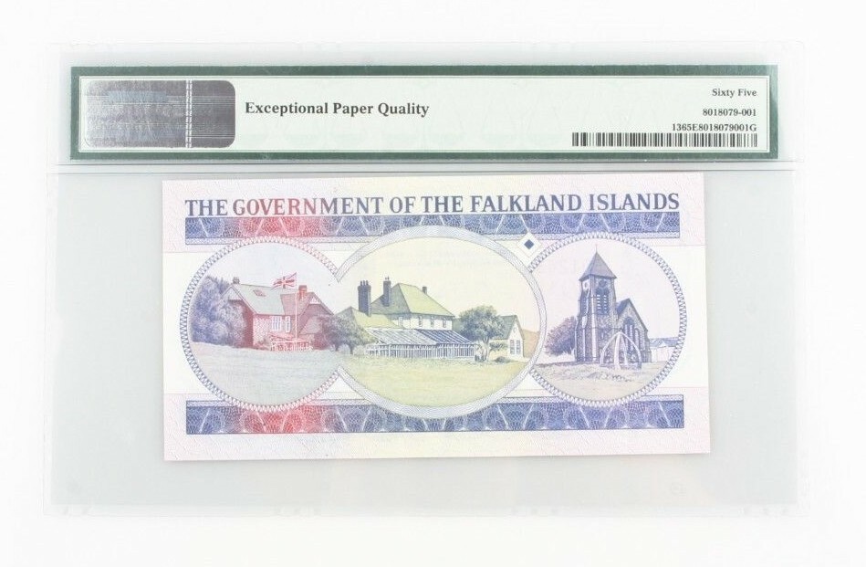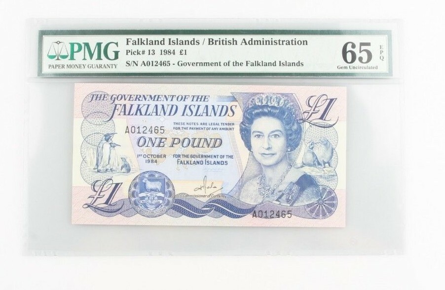 Scelle dans un support PMG avec le titre "Îles Falkland / Administration britannique // Pick # 12 1984 1 // s / n a012465 - gouvernement des îles Falkland"