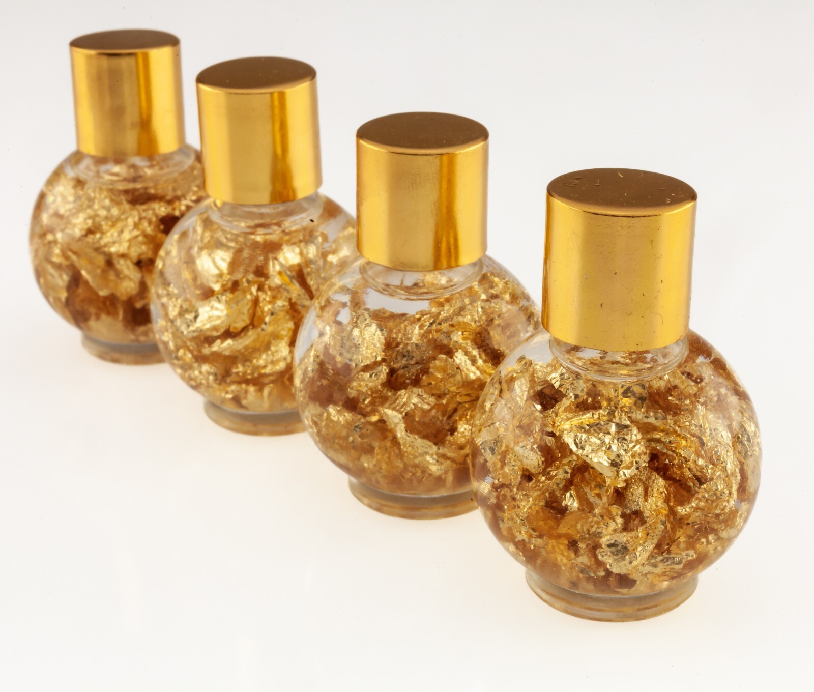 Comprend 4 flacons en verre de feuilles d'or suspendues dans du liquide