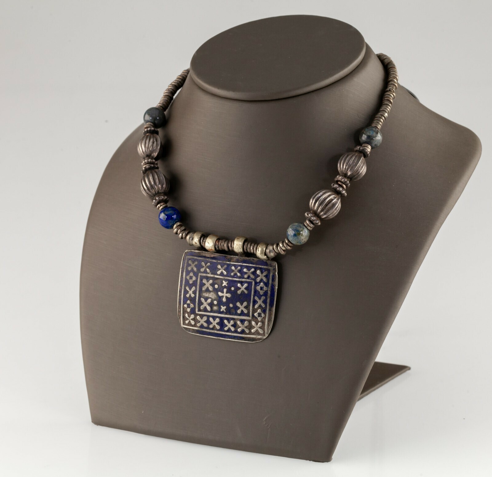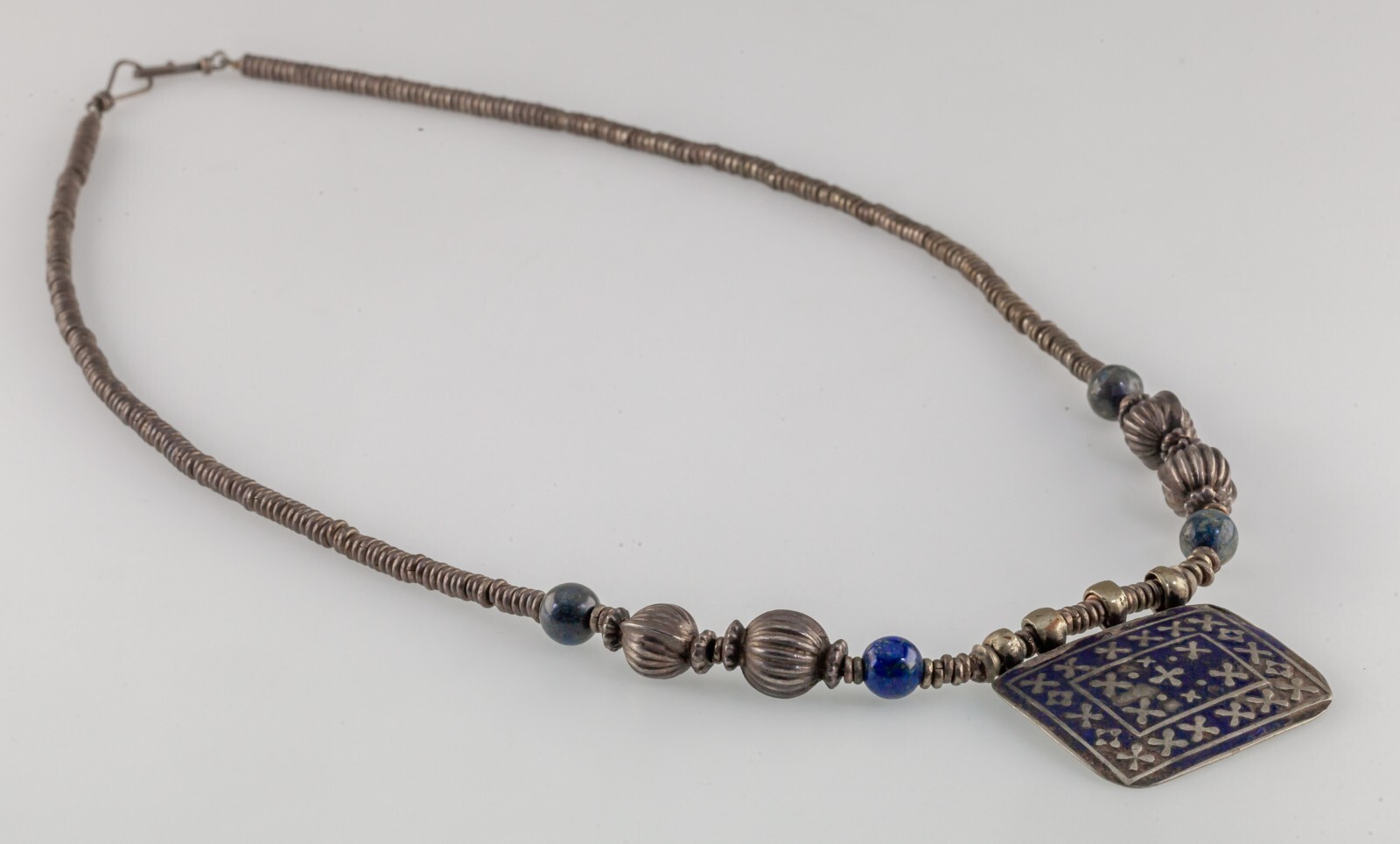 Ancien Argent Perlé Collier Avec Lapis Accents Et Émail Pendentif