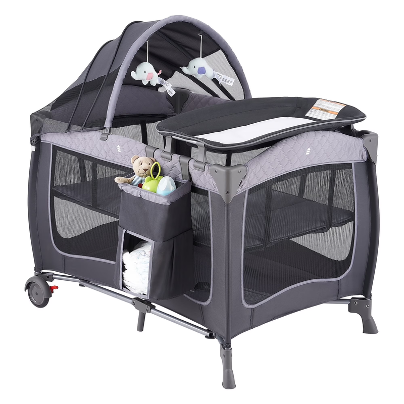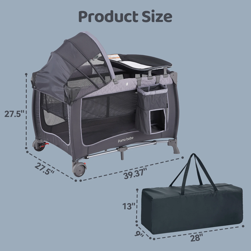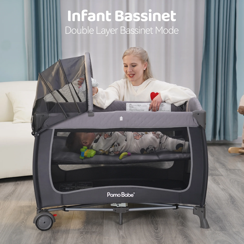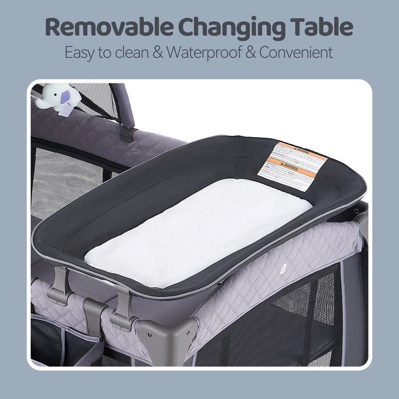 MULTI-PURPOSE PLAYARD--The design of the changing table allows the mother to easily change diapers, and the comfortable bassinet provides a place for the baby to rest. The storage bag will provide you everything when you are ready to change diaper for your baby; CONVENIENT DURABLE NURSERY CENTER--There are two wheels with brakes at the bottom of the baby playard so that it can move flexibly. This nursery center is composed of strong frame and thick fabric so that it can hold the baby weights up to 33lbs; DETACHABLE; FOLDABLE DESIGN--The changing table, storage bag, bassinet and canopy can be easily removed from the baby playard. And the playard can be quickly folded up without extra tools. The handbag helps you store the folded crib and take the crib out for travel.; DETACHABLE CANOPY with 2 TOYS-- The detachable canopy can protect your child's eyes from strong light. The two hanging toys can attract the baby's attention, not only promoting the baby's visual development but also improving the grasping ability; EASY TO ASSEMBLE Easy to put the playard together without any tools. The mesh design provides a better visibility for parents to observe the baby at any time. The wide space allows the baby to practice standing and playing after removing the bassinet. Safety Playard The Playard with an incline less than or equal to 7 degree from horizontal while in using.