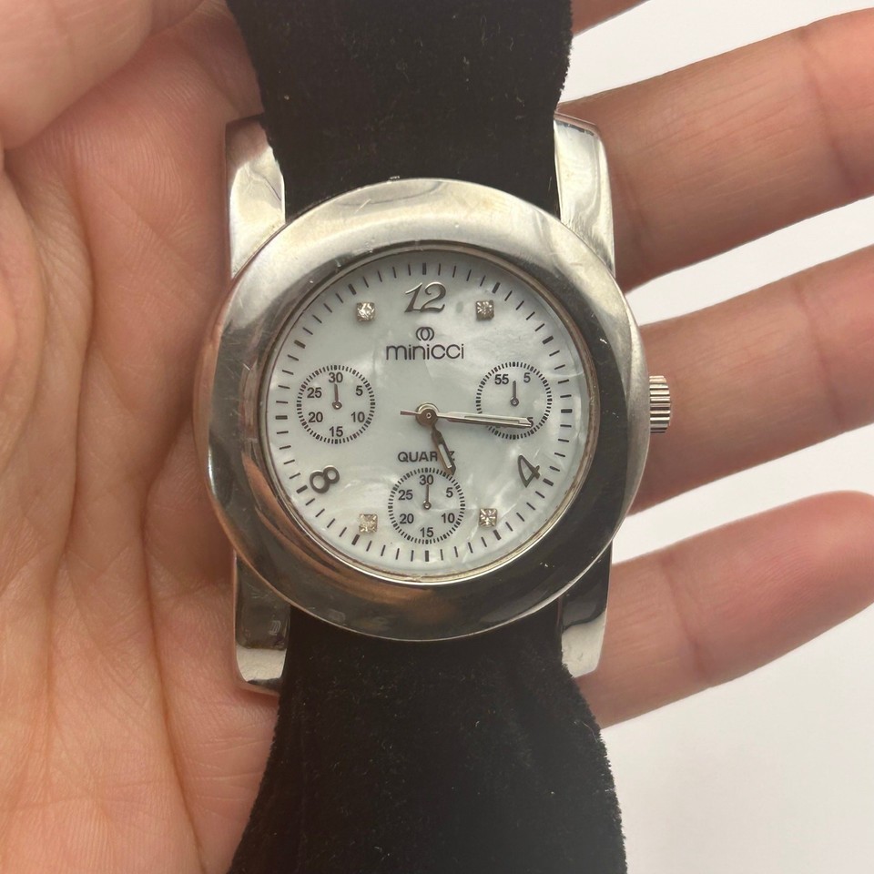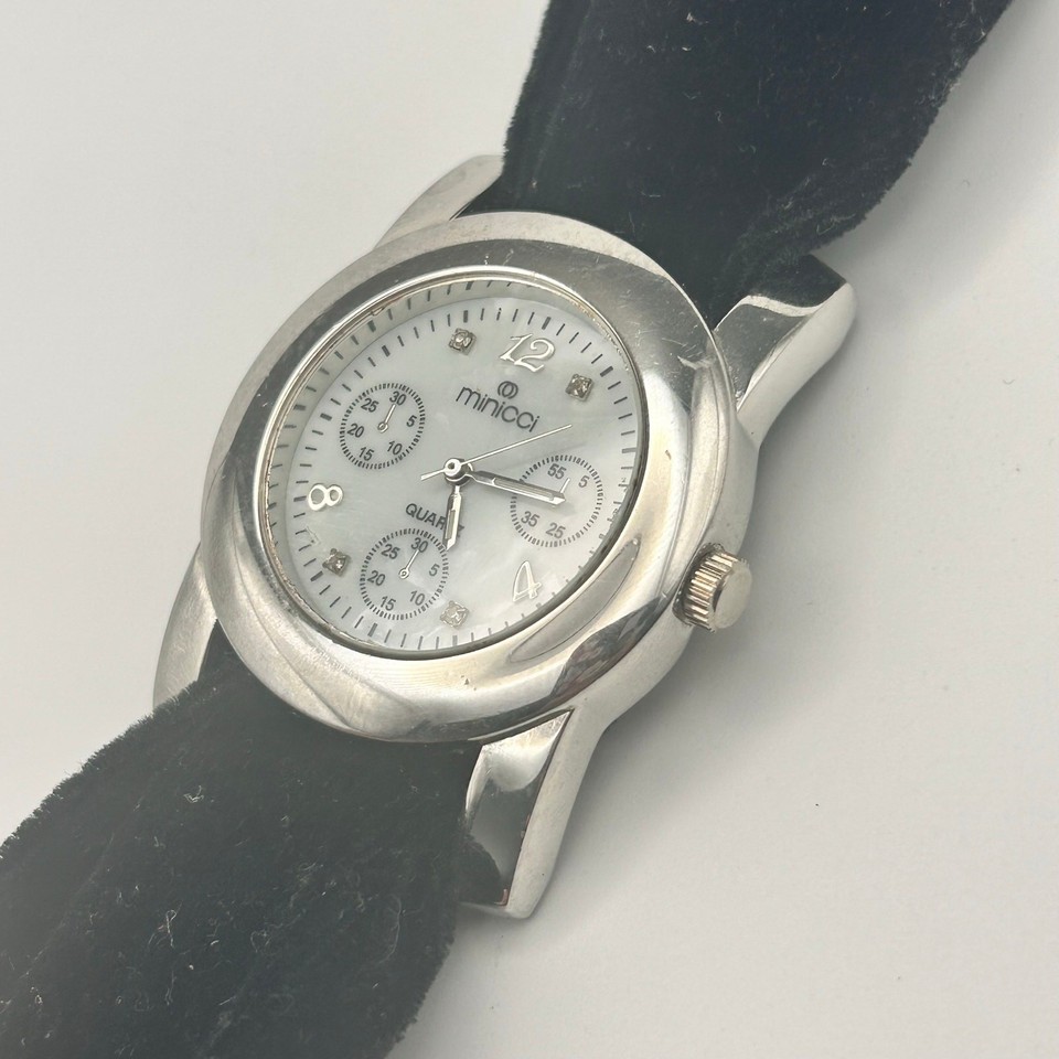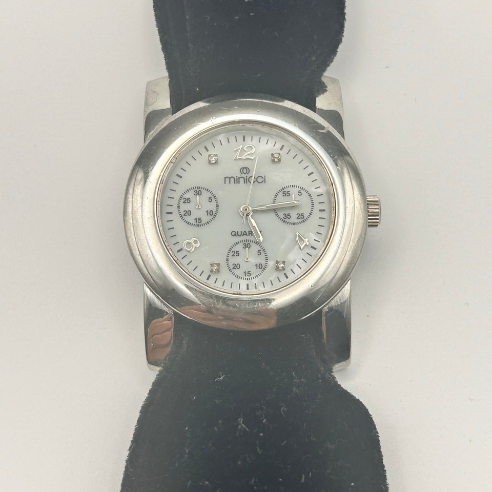 This is a beautiful MINICCI women's watch. The watch features a silver case, a mother of pearl dial, and a black strap.