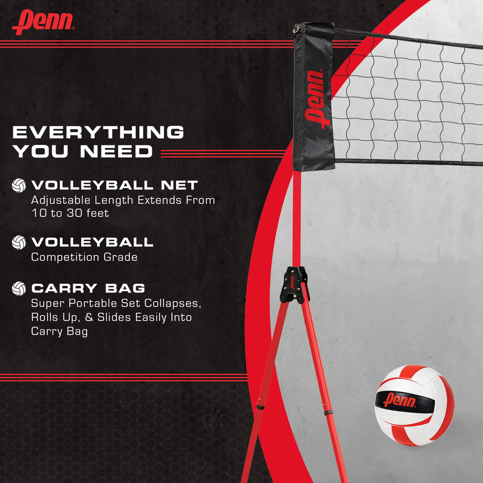 The Penn Easy Fit Premium Volleyball Set from EastPoint Sports is made to fit any yard. The adjustable length net extends from 10 feet to 30 feet! Fully assembled net stands at co-ed height of 7 ft. 1 in. 30 ft. Wide. The Easy Setup net and post design makes set up a breeze - you'll be serving and spiking in just minutes! This super portable set collapses, rolls up and slides easily into the included carry bag Complete with competition-grade volleyball and pump.
