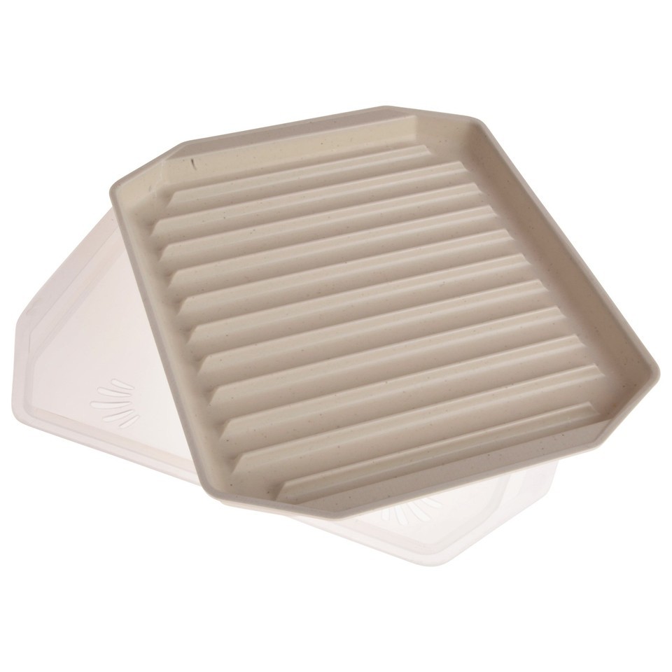 Nordic Ware Microwave Safe Covered Bacon Rack with Lid in White Plastic with Lid. Prevent the greasy mess of making bacon the traditional way by using the Nordic Ware covered bacon rack in the microwave for mess free and quick cooking. The covered bacon rack has a compact design that fits in even the smallest microwaves. The clear lid prevents messy splatters and the ribbed design elevates food above the drippings so the grease flows away. Great for cooking bacon, sausage, hot dogs as well as heating leftovers and defrosting foods. This is made from BPA and Melamine free plastic.
