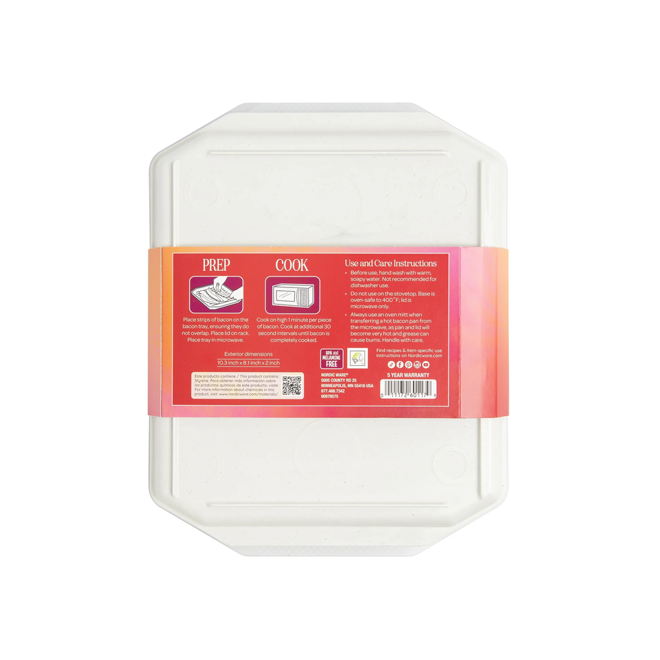 7.6" x 8.8" Cooking surface Bacon rack fits even the smallest microwaves Lid prevents messy splatters Ribbed design elevates food above the drippings BPA and Melamine free Top rack dishwasher safe Made by Nordic Ware Color: White and clear Dimensions (L x W x H): 8.1" x 10.3" x 2"