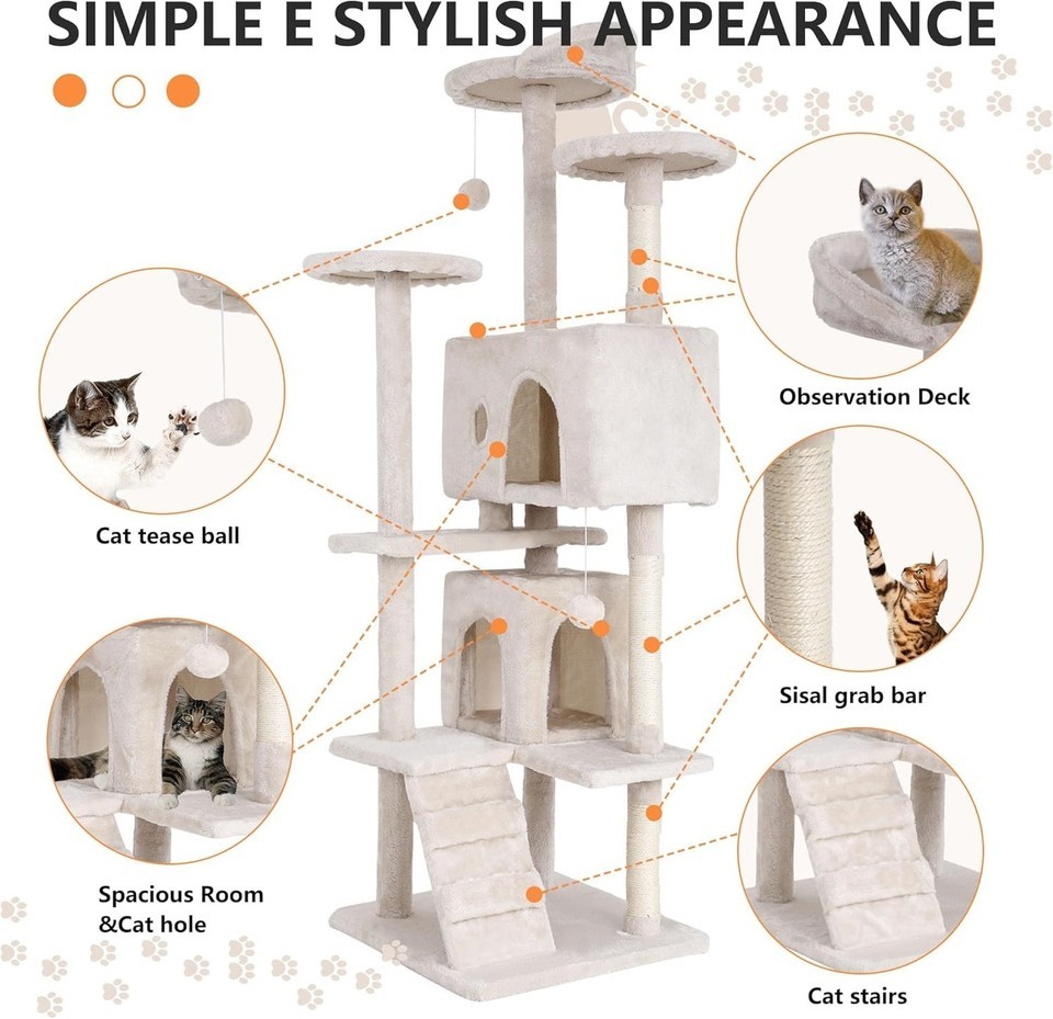 ?QUALITY PROTECTIVE MATERIALS?Made of high-quality natural particle board, reinforced base, skin-friendly plush cover, and natural sisal scratching posts, this cat climbers for indoor cats is designed to provide your cat with a safe, sturdy, and stable home entertainment center. Your furry family will love the plush feel of the big cat tree and enjoy exploring and sniffing around their new home.