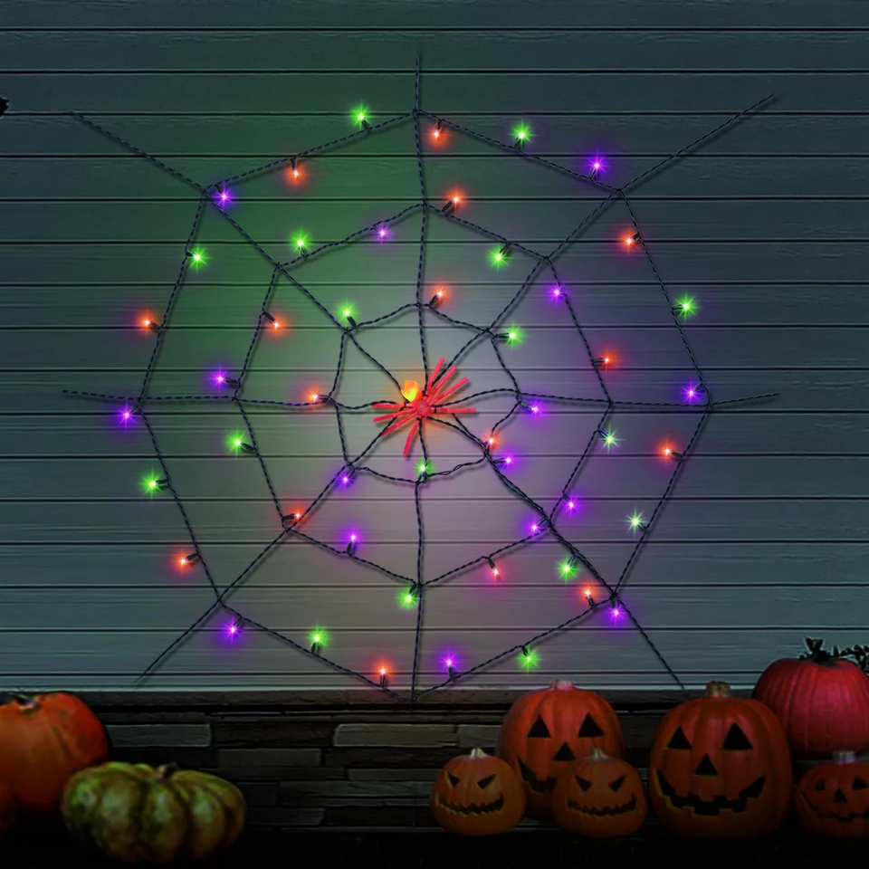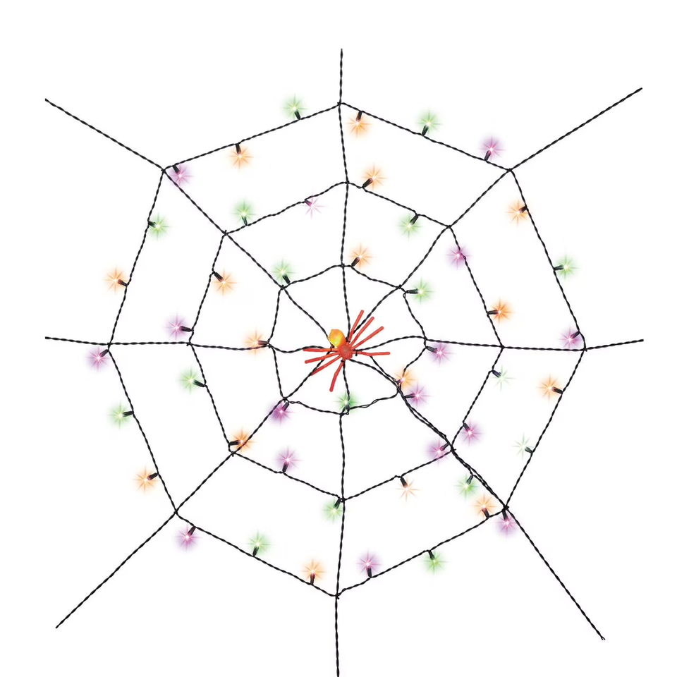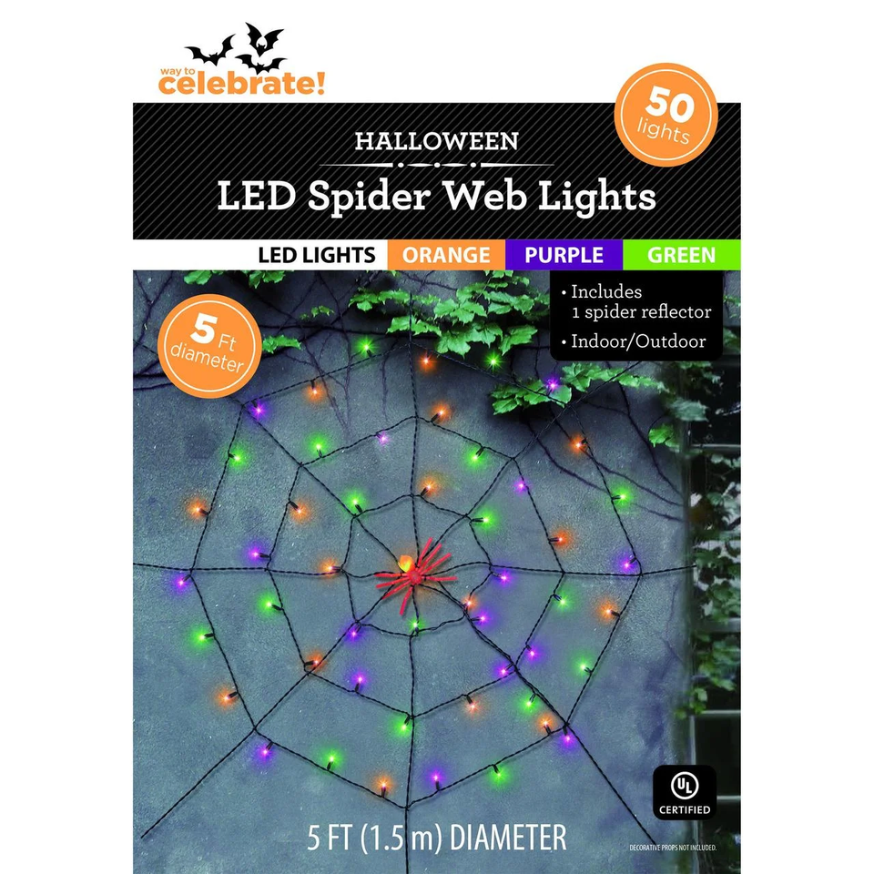 Way To Celebrate Halloween Indoor/Outdoor LED Spider Web Lights, Multicolor, 5' Features 50 colorful LED lights in orange purple and green Measures 5 feet in diameter for bold decorative impact Includes a spider reflector for added creepy detail Perfect for walls windows porches or party setups inside and out
