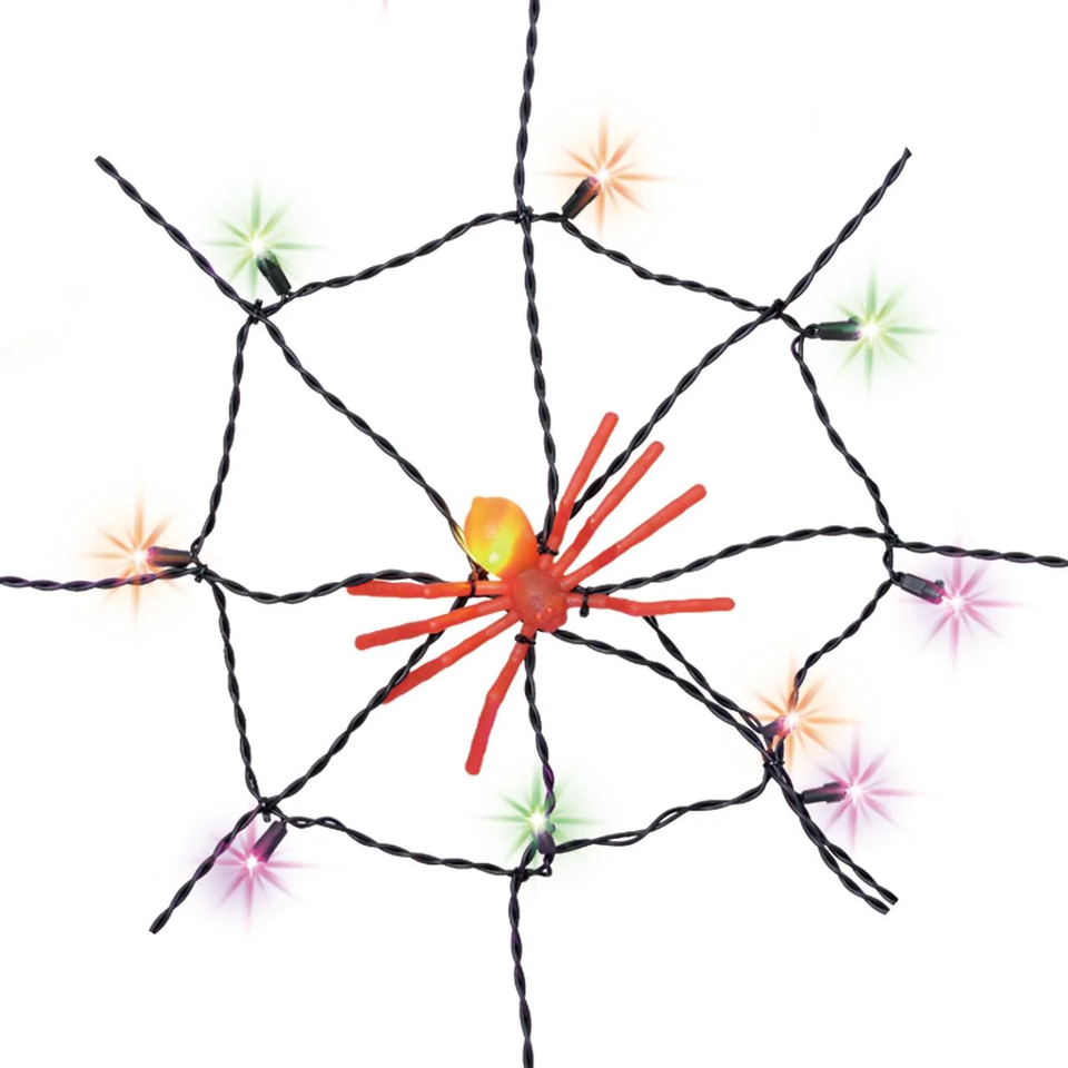 Weave a web of glowing spookiness with the Way To Celebrate Halloween Indoor/Outdoor LED Spider Web Lights! With a five-foot diameter and 50 bright LED lights in festive orange, purple, and green, this illuminated web makes the perfect statement piece for your Halloween decor. Designed for both indoor and outdoor use, it includes a creepy-cute spider reflector to sit at the center of your glowing trap. Hang it on your wall, in a window, or on your porch to instantly add eerie charm and electrifying ambiance. Spin the ultimate Halloween display with the Way To Celebrate Halloween Indoor/Outdoor LED Spider Web Lights!