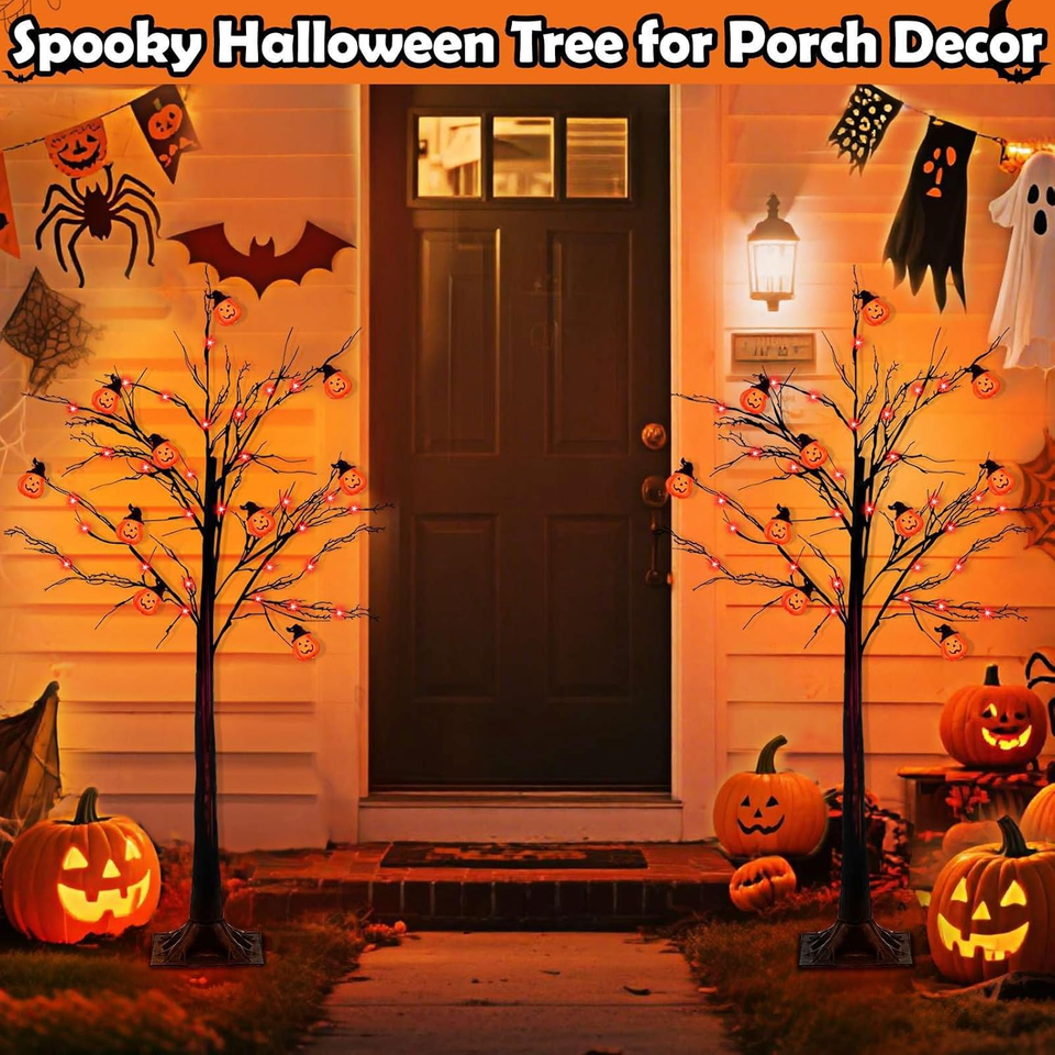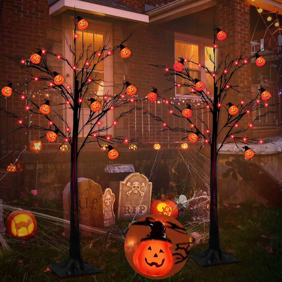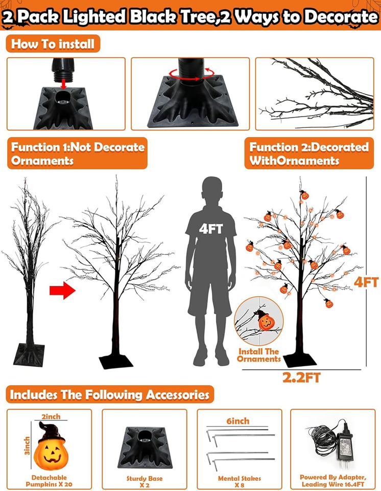 2 Pack Black Halloween Trees: 4FT Halloween trees, doubling the festive flair?96 orange LEDs total and 20 Jack-O-Lantern pumpkins. Each tree has 6 big branches (2.2ft wide assembled) and 4 ground stakes per base to withstand outdoor wind