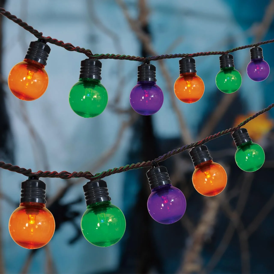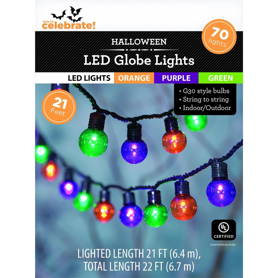 Way To Celebrate Halloween Indoor/Outdoor LED G30 Globe String Lights, Multicolor, 21' Includes 70 colorful LED lights in orange purple and green Measures 21 feet lighted length with a total length of 22 feet G30 globe-style bulbs provide a glowing seasonal effect Designed for both indoor and outdoor decorating with string-to-string capability