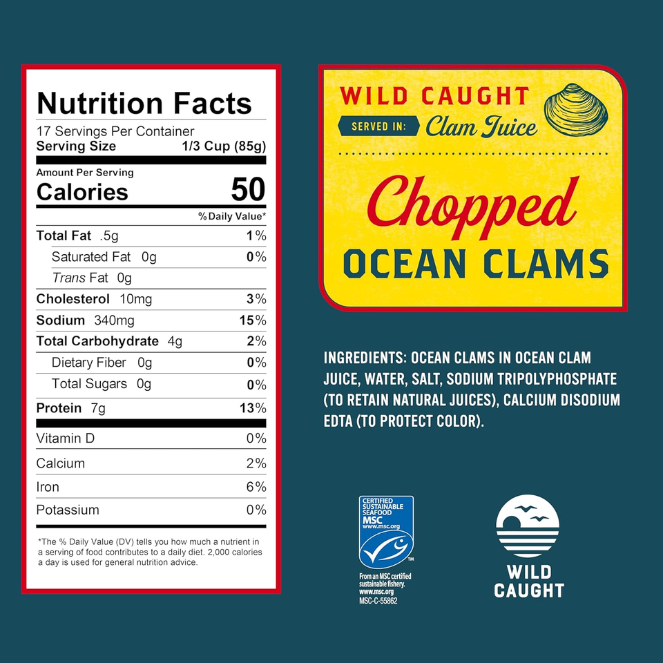 Ocean Chopped Clams Canned, 51 Oz Can - 7G Protein per Serving - Gluten Free, No