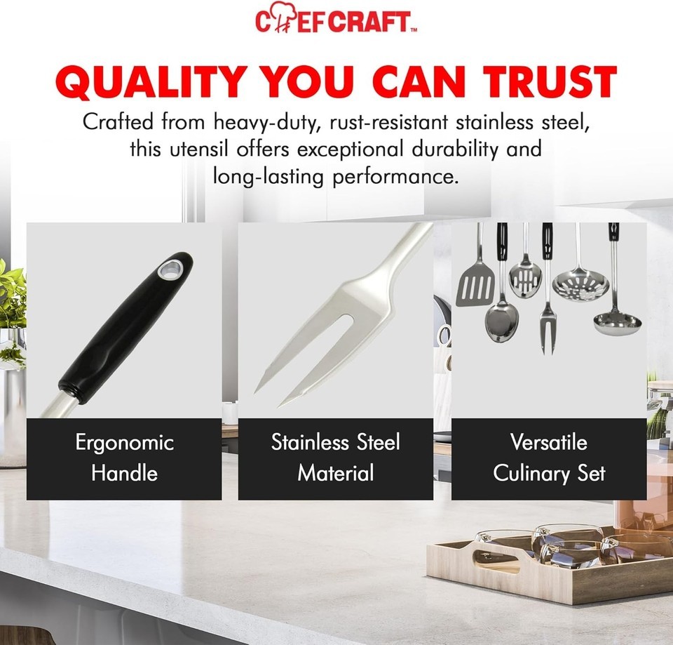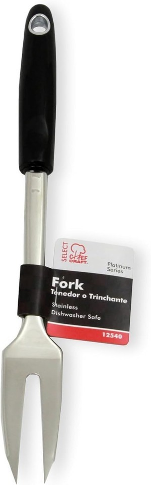 This fork's single stainless steel construction makes it a great go-to for durable daily use. The plastic handle fits comfortably in your hand you won't want to put it down! The stainless steel works great for cast iron and stainless steel pans. The hole in the handle makes for simple and easy storage. 12 Inch length provides enough distance from the pan to prevent getting burnt while sharp points allow for a way to poke and turn meat. Two pronged fork is durable enough for cooking and attractive enough for serving. Dishwasher safe to help with efficient clean up.