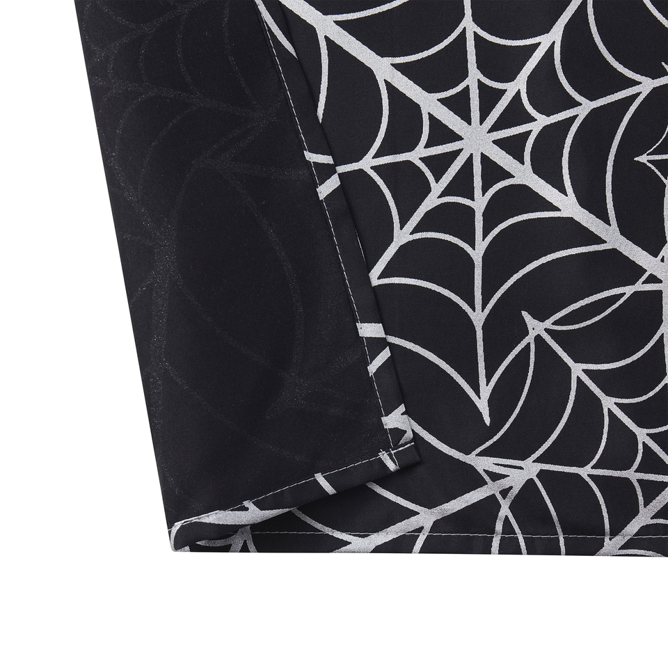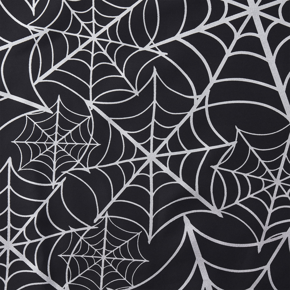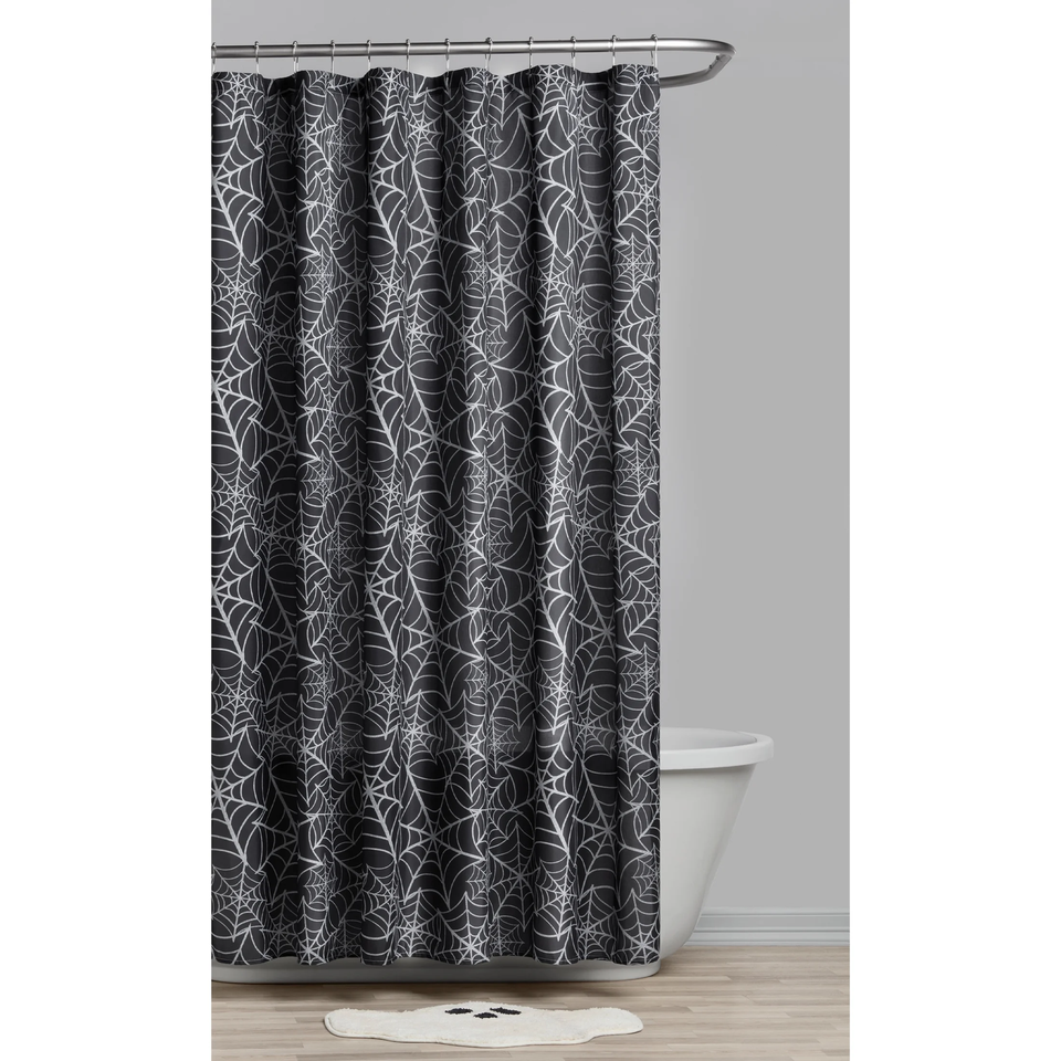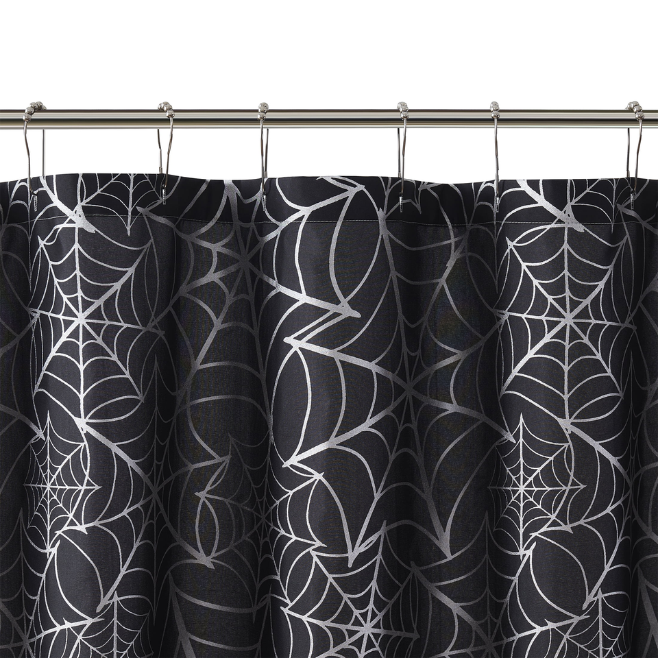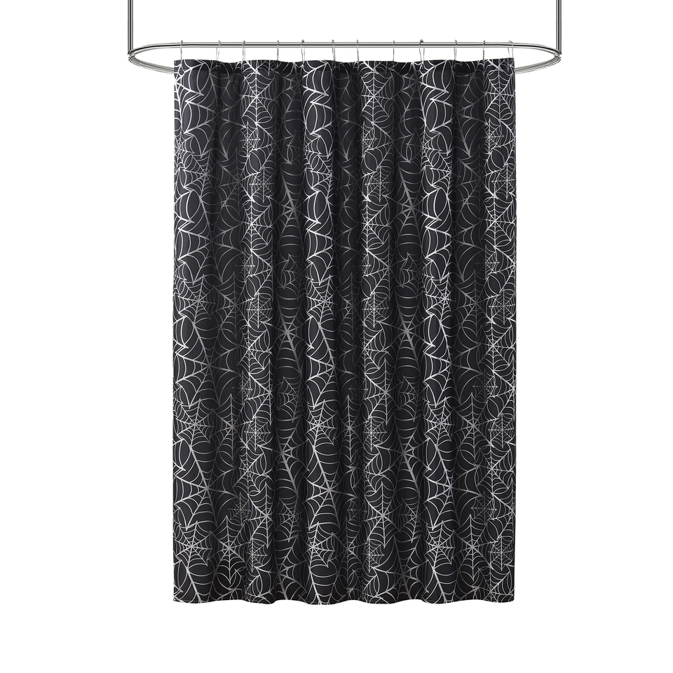 Spooky shower curtain Features metallic silver spiderweb patterns Made with 100% polyester Measures 72 x 72 inches Machine washable for quick and easy care Coordinates with Way to Celebrate! Halloween bathroom decor (sold separately) Pair with your favorite waterproof liner and shower hooks (not included)