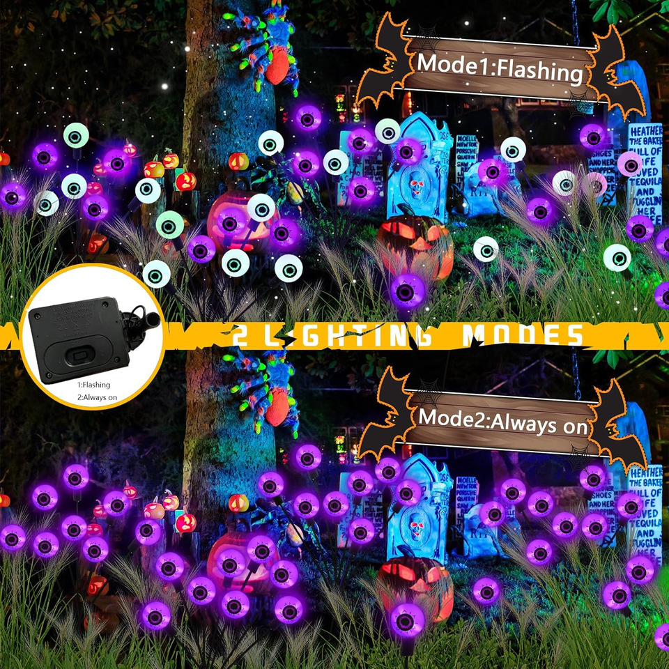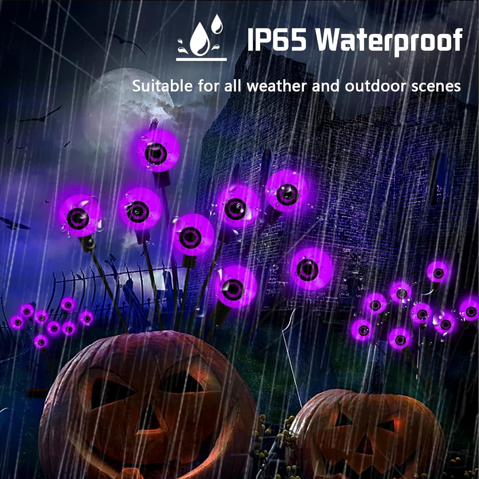 ??2 Modes Solar Scary Eyeball Lights?These new upgraded eyeball swaying firefly lights have two modes: steady on and blinking, and you can choose whichever mode you like. The perfect combination of bloodshot purple eyes and eerie green light easily creates a scary atmosphere and is the perfect Halloween decoration.