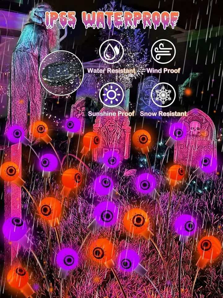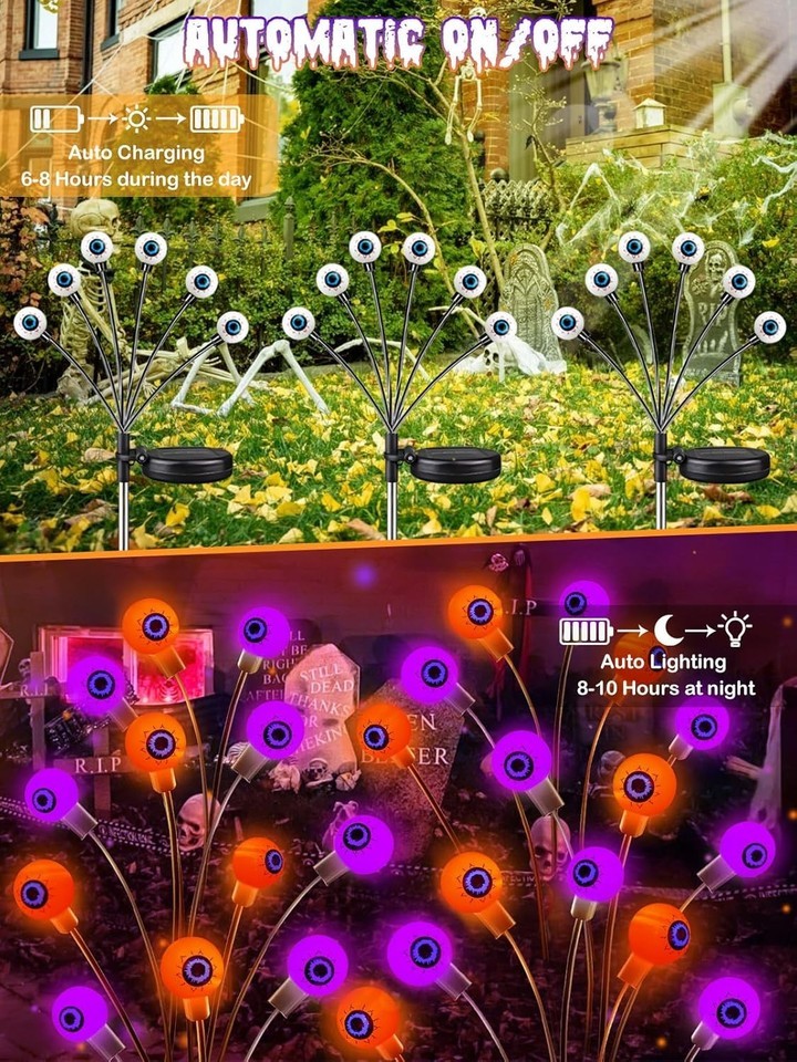 Easy Installation and Long-Lasting Use: These outdoor Halloween decorations eyeballs lights are made of high-definition, durable plastic that can withstand heat and cold. And the solar garden lights are easy to install. No wires or tools required, simply unfold the solar panel, turn on the switch, connect it to the ground stake, and then insert it into the proper position.