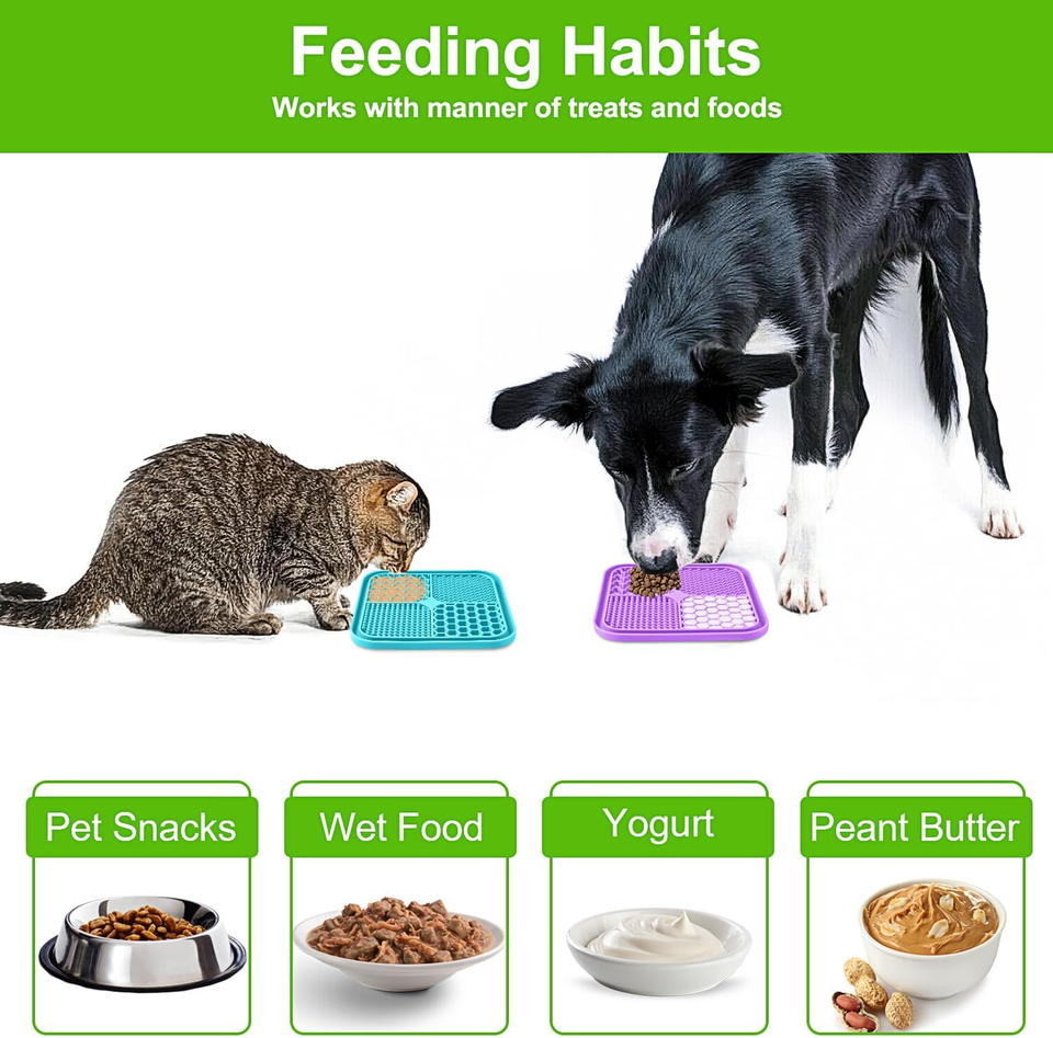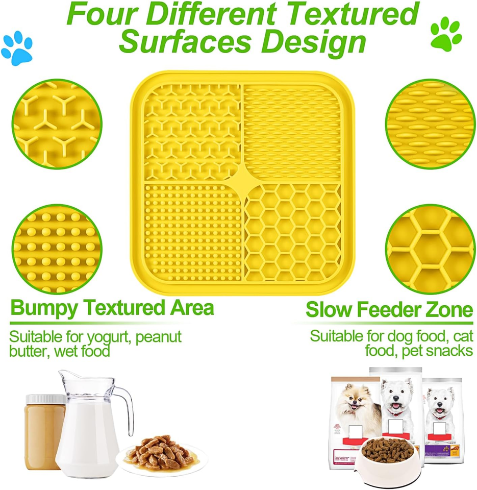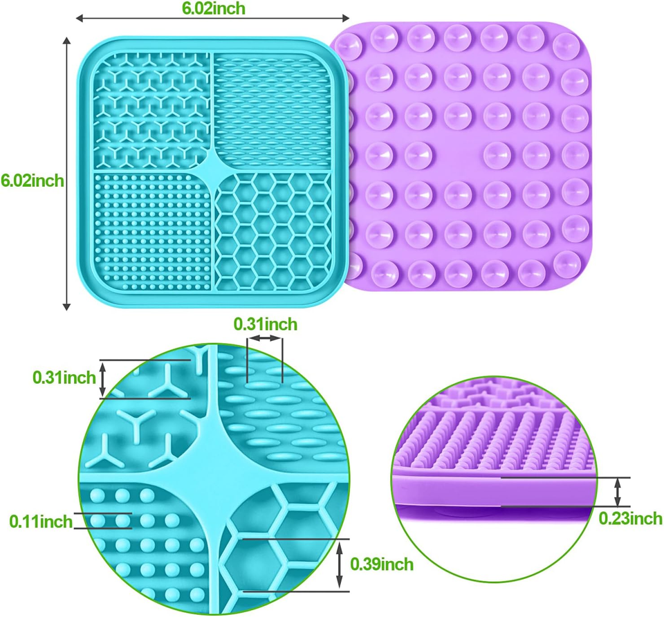 ?Slow Feeder Mat for Dogs Cats?: Four different textured surfaces design is prefect for spreadable treats, such as cream cheese, yoghurt, peanut butter and so on. It is a peanut butter mat for dogs to extend the feeding time and aid digestion. This lick mat is an ideal size for cats, puppies, small meduim and large dogs.