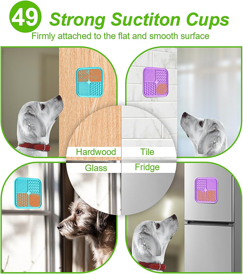 ?49 Super Suctions?: The back of this licking mat is equipped with 49 high-strength suction cups, which can be well fixed on various walls or glass, refrigerators. It is a good distraction toy for pet bathing grooming and dog nail trimming.