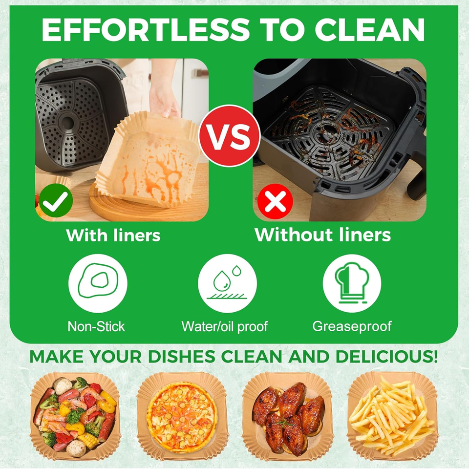 Easy Cleanup: The air fryer paper liners are like a square bowl, which can effectively keep your air fryer away from food residues and protect the side of fryers. Keep the bottom of air fryer basket clean and make cleanup a breeze