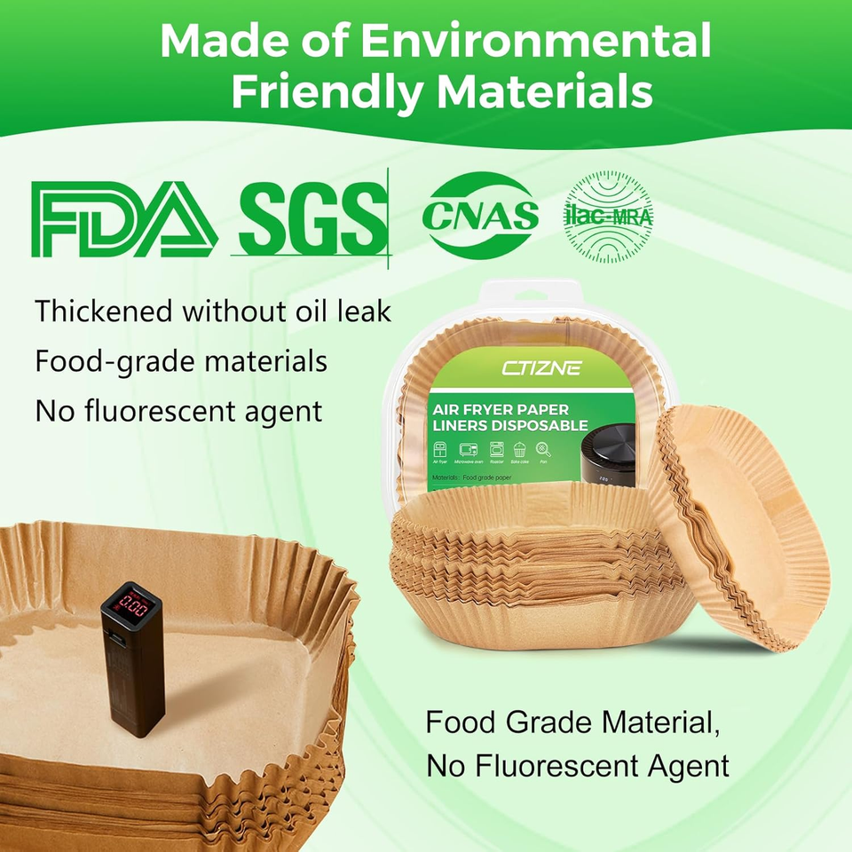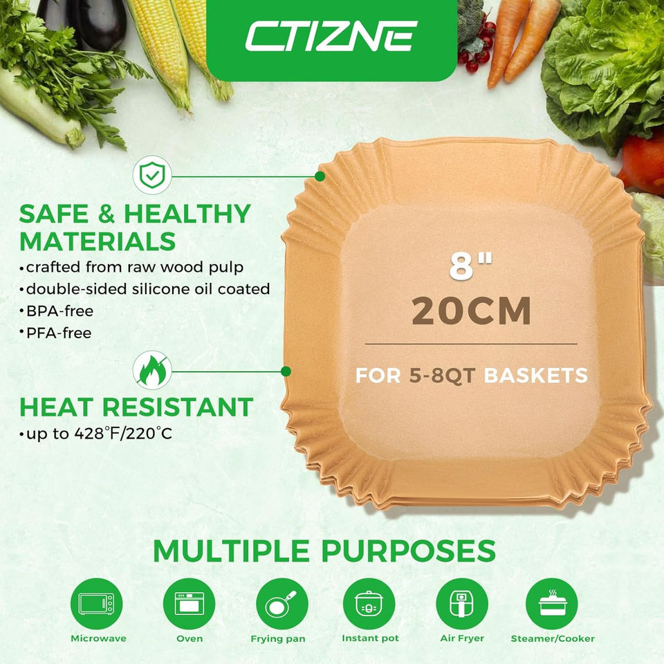 Liners Size: Ctizne air fryer paper liners are in 8 inches at bottom diameter, suitable for both round and square baskets between 5 and 8 qt. Heat resistant temperatures up to 428 fahrenheit