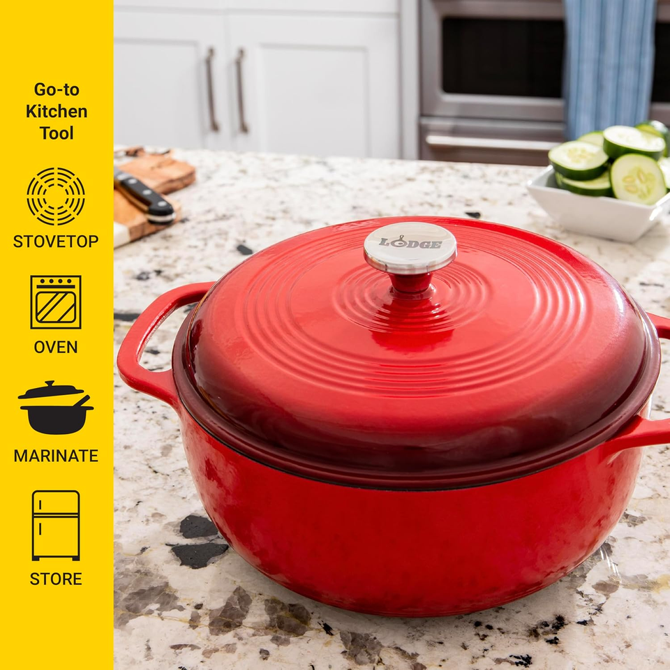 YOUR GO-TO DUTCH OVEN: A flawless pairing of form and function that doesn't quit. The Lodge Dutch Oven not only makes your kitchen look good but is an enameled cast iron classic great for preparing and serving memorable meals. Broil, braise, bake or roast your favorite meals in the oven up to 500 Degree F.