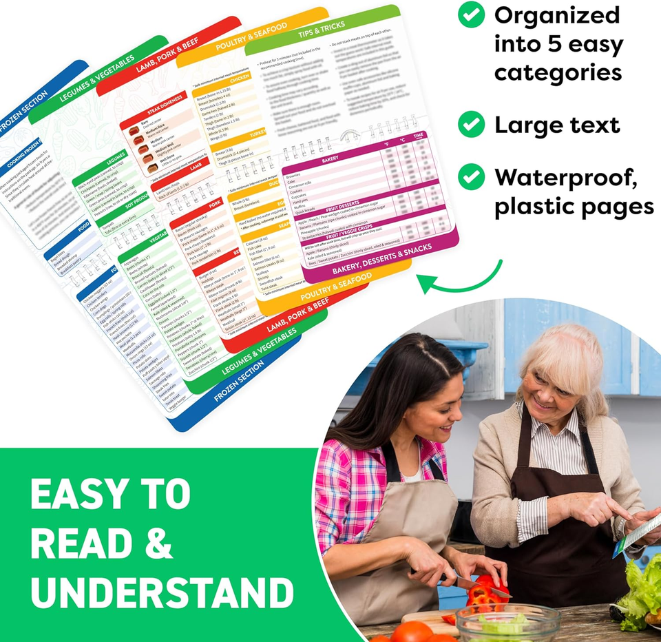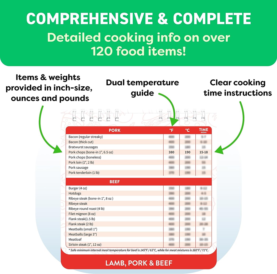 Comprehensive and Beginner-Friendly. Handy air fryer cookbook guide with 120+ foods across 5 categories, this air fryer cheat sheet magnet offers precise cooking times and temps for meats, veggies, snacks, and more. Designed for accessibility and quick reference, this kitchen gadget helps beginners master air fryer recipes effortlessly - perfect for healthier, faster daily meals.
