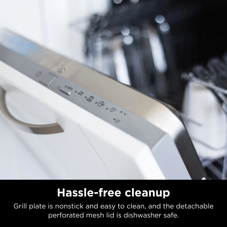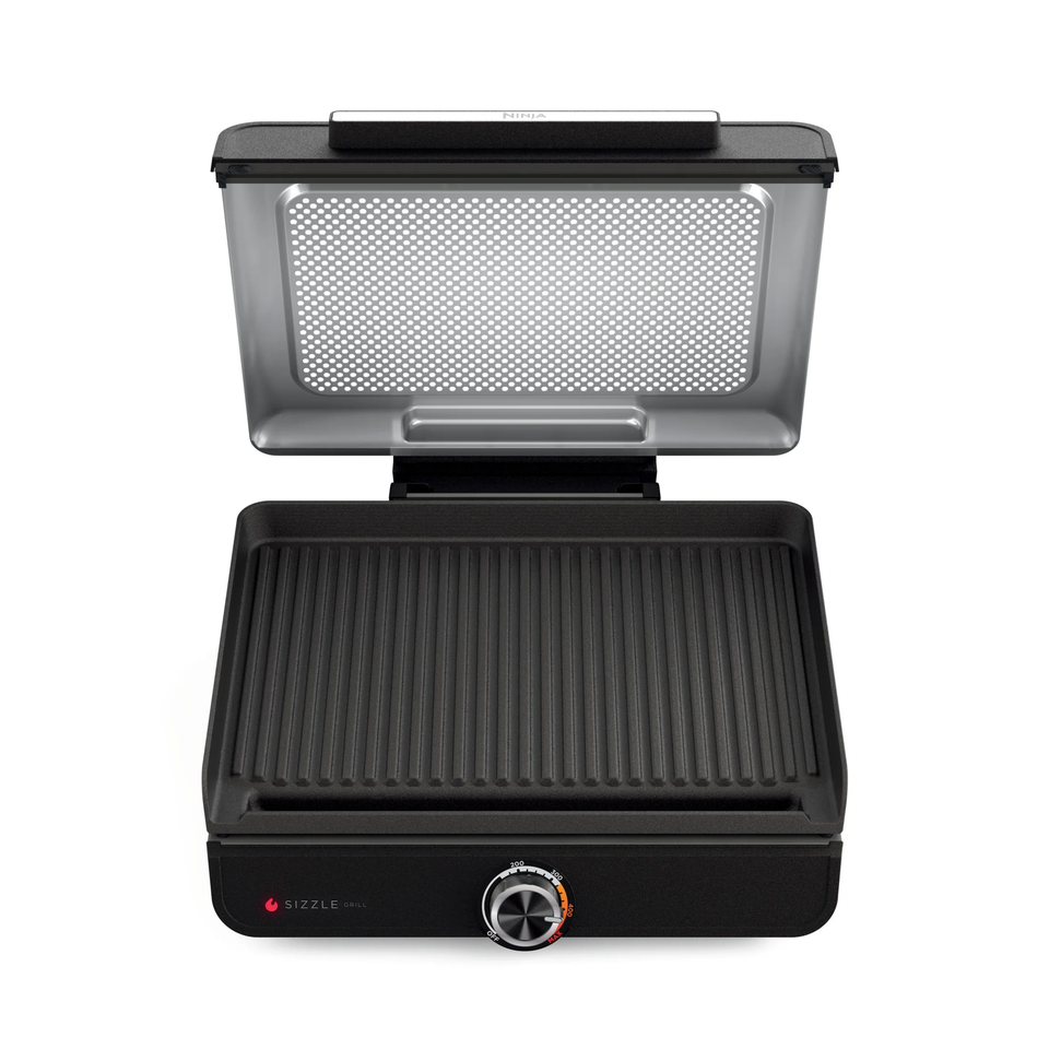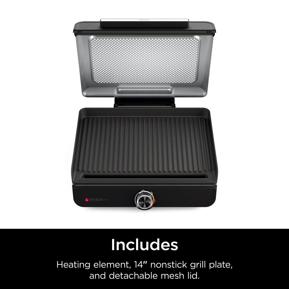 500F MAX HEAT: Reach temperatures of up to 500F for high-heat grilling and searing and get better char-grilled marks* right from your kitchen (*vs. PowerXL Smokeless Grill Elite) EDGE-TO-EDGE COOKING: No hot spots. No cold spots. Just even, edge-to-edge heating for perfectly grilled dishes every time *LOW SMOKE GRILL: The perforated mesh lid helps to control smoke in your kitchen and reduce splatter, and the plates are equipped with high walls and grease catches for a pleasant cooking experience. *Smoke output may vary depending on type of meat and fat percentage. FAMILY-SIZED CAPACITY: The 14 grill plate fits a half dozen burgers and chicken breasts to feed a family of 4-6 people HASSLE-FREE CLEANUP: The removable grill plate is nonstick and easy to clean, and the perforated mesh lid is detachable and dishwasher-safe COOK HOOD UP OR HOOD DOWN: Give a blast of concentrated high-heat with the hood up or drop the lid to retain heat and melt toppings WHATS INCLUDED: Ninja Sizzle Smokeless Indoor Grill, 14 Nonstick Grill Plate, Quick Start Guide with 10 Recipes SIZE: 14.72"L x 15.16"W x 6.1"H